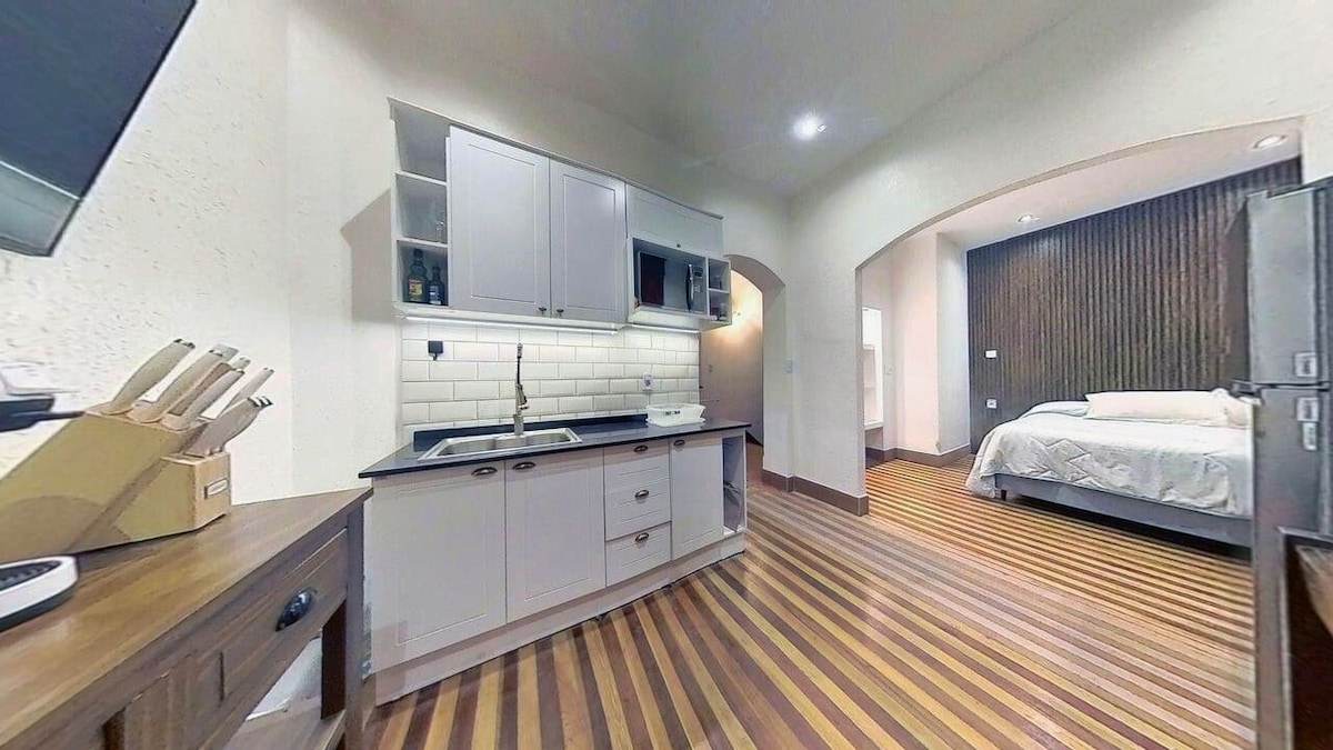 Sunny Studio on the best location in the Historic District. Completely recycled in a house of the nineteenth century. Steps away from museums and tourist attractions as well as the famous Mercado del Puerto and the port terminal that connects with Buenos Aires. With everything you need for a comfortable and enjoyable stay. Very spacious and sunny with roof-to-floor windows leading onto a pedestrian street. The building has access to the rooftop with barbecue where you can cook your own "asado"