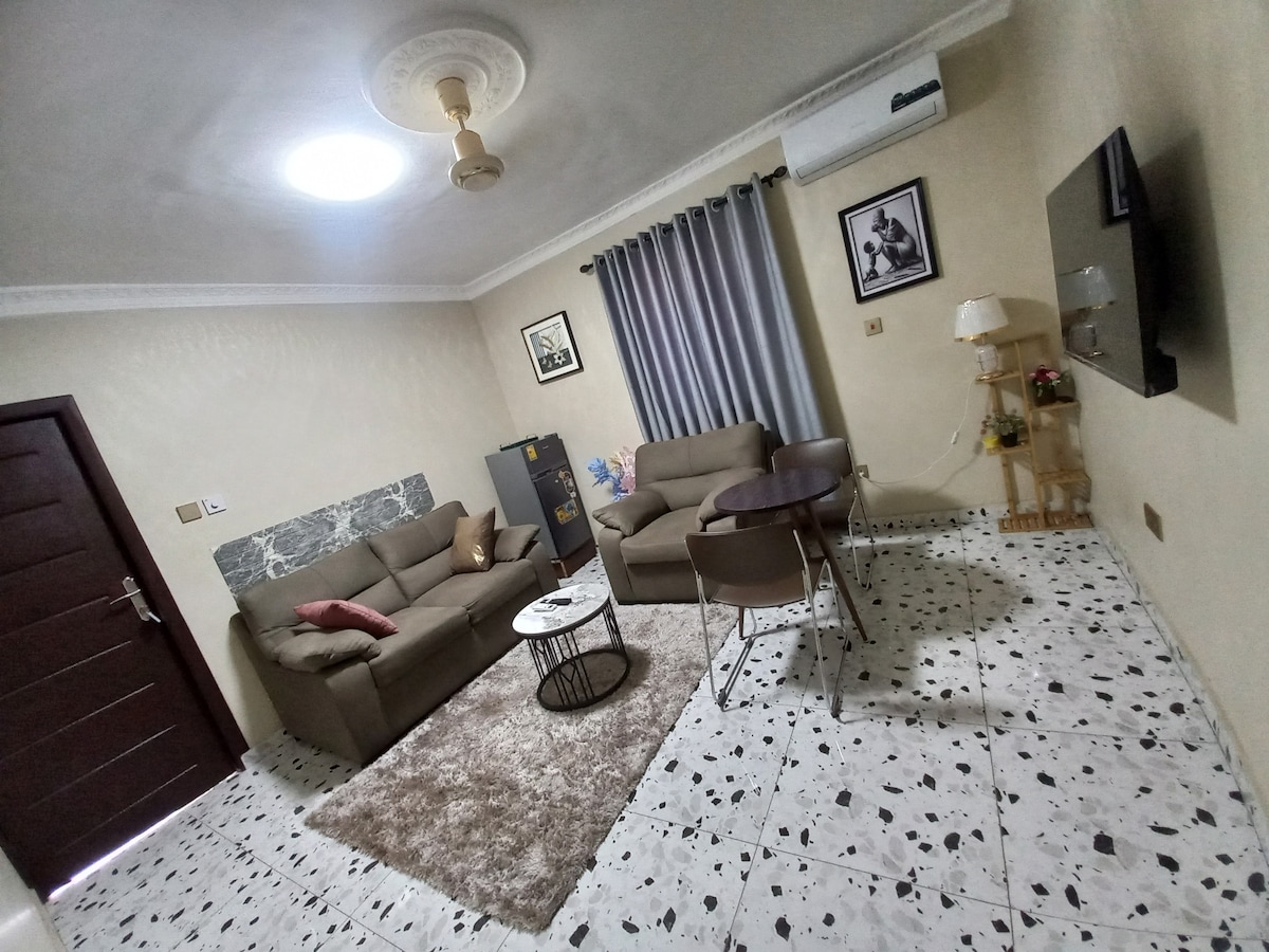 This Is A Fully Furnished Condo Apartment With One Bedroom And A Living Room. The Place Is Centrally Located Approximately 25 Minutes Away From Kototoka International Airport And 10-15 Minutes Away From Accra Mall. The Place Is Furnished With A Comfortable King-Sized Mattress, Two Air Conditions, High Speed WIFI Internet, A Fully Functional Kitchen, A Dedicated Working Space And A Washroom Borteyman Stadium (7 mins walk) China Mall (8.1 km) Tema Hospital (9km) Restaurants/Shops-Walking Distance