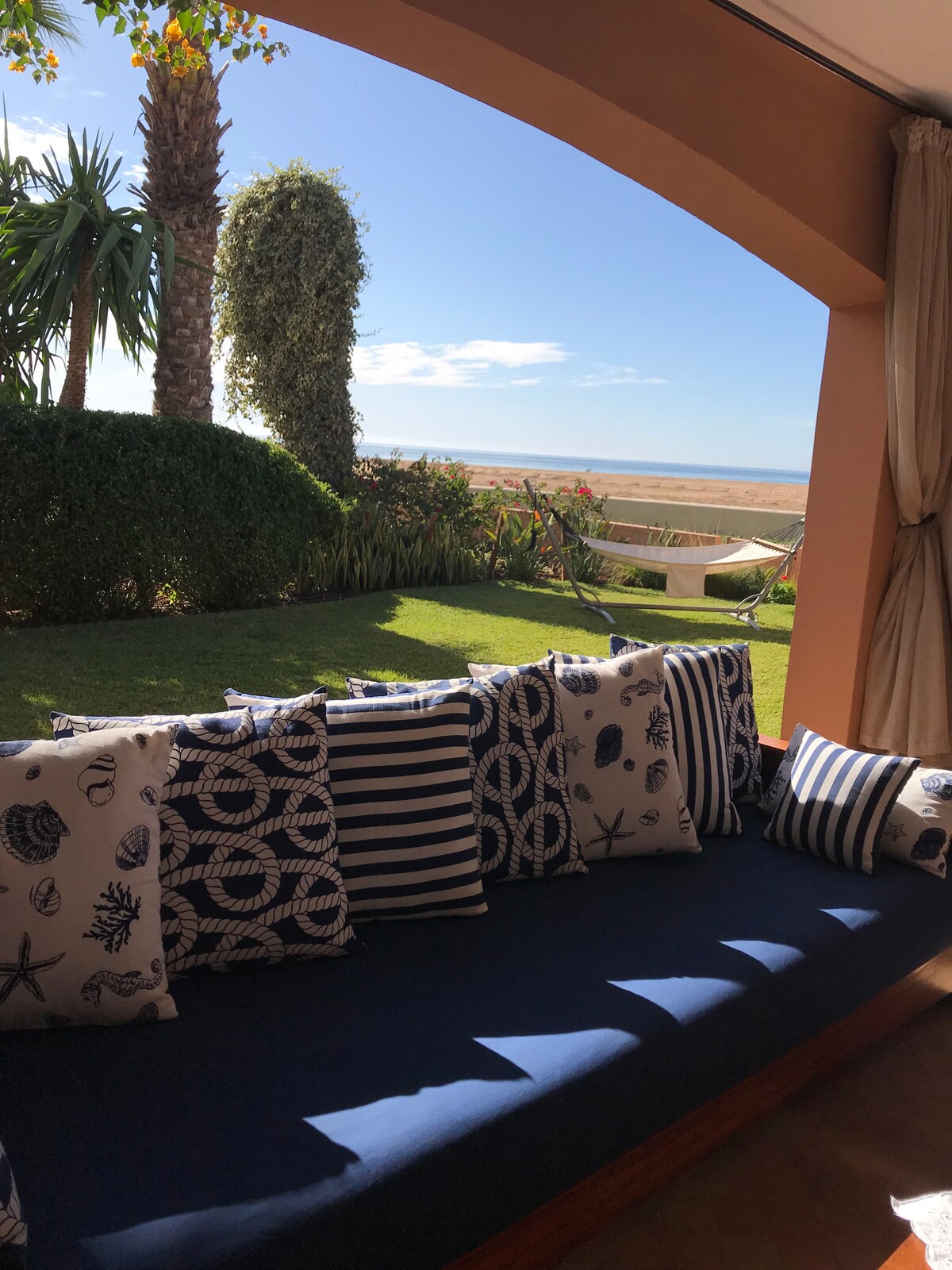 Willkommen, Marhaban, Bienvenue und Welcome! Das im maurischen Stil erbaute Haus liegt am Hang direkt an der Atlantikküste. Im oberen Stockwerk befinden sich 2 Apartments mit Duschbad und Terrassen, im unteren Stockwerk Küche, Schlafzimmer, Bad und Wohnzimmer mit Kamin. Zwei Terrassen mit Garten münden auf den glatten Felsen. Zum hauseigenen Strand sind es nur 3 Gehminuten. Je nach Wellengang kann man auch direkt vorm Haus ins Wasser springen.