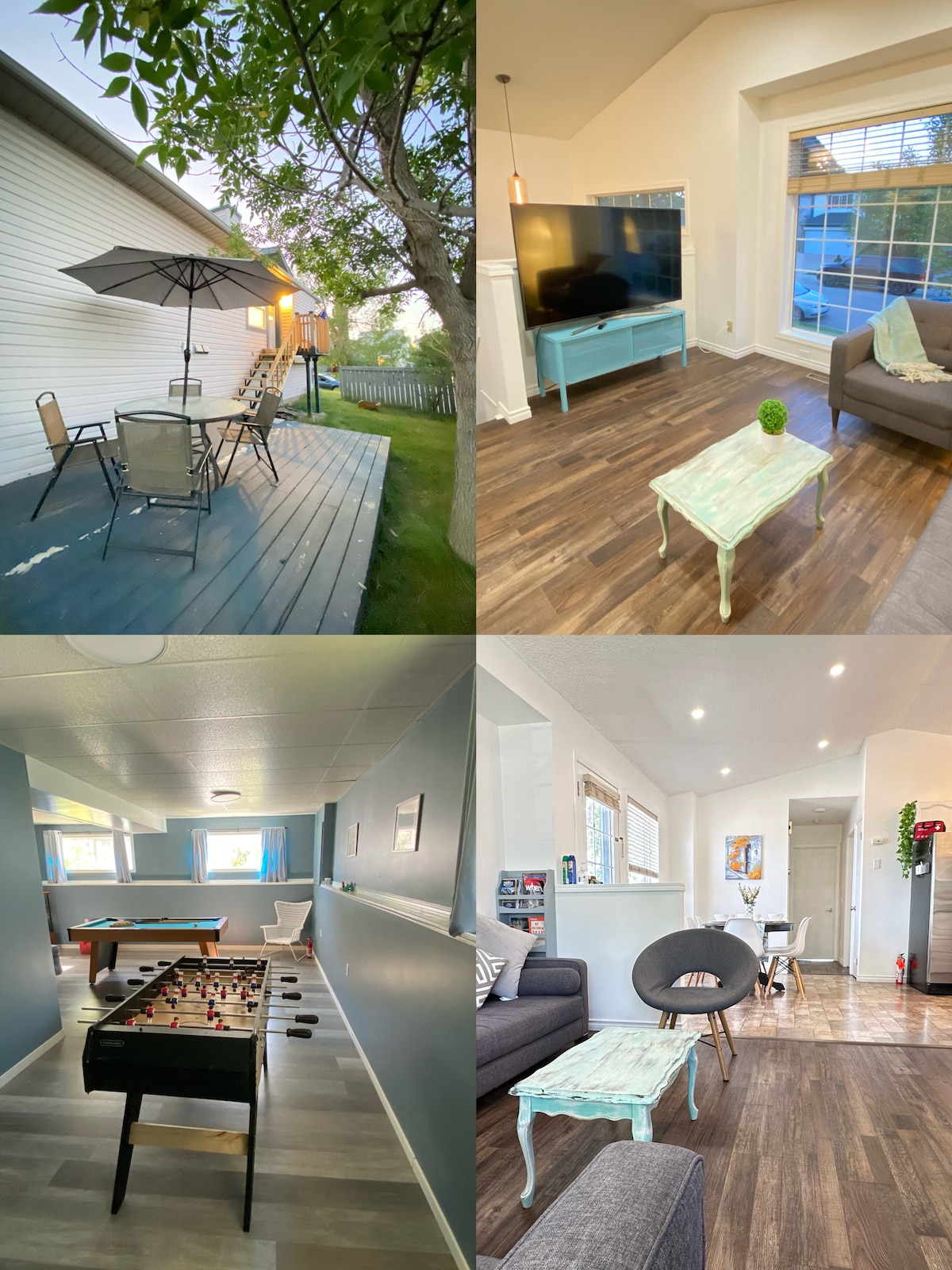 This walkoutbasement features: One cozy bedroom with a queen bed, full bunk bed and air mattress three-piece bathroom Spacious Kitchenwith dining table and chairs. A bright living room with 9-foot ceilings and large windows. TV, a sectional sofa, a fireplace, and sofa bed. There's also a work space with a desk and chair. Laundry Facilities Large Backyard and access to a beautiful pathway around a nearby pond. This unit has easy access to Deerfoot Trail and is close to the airport