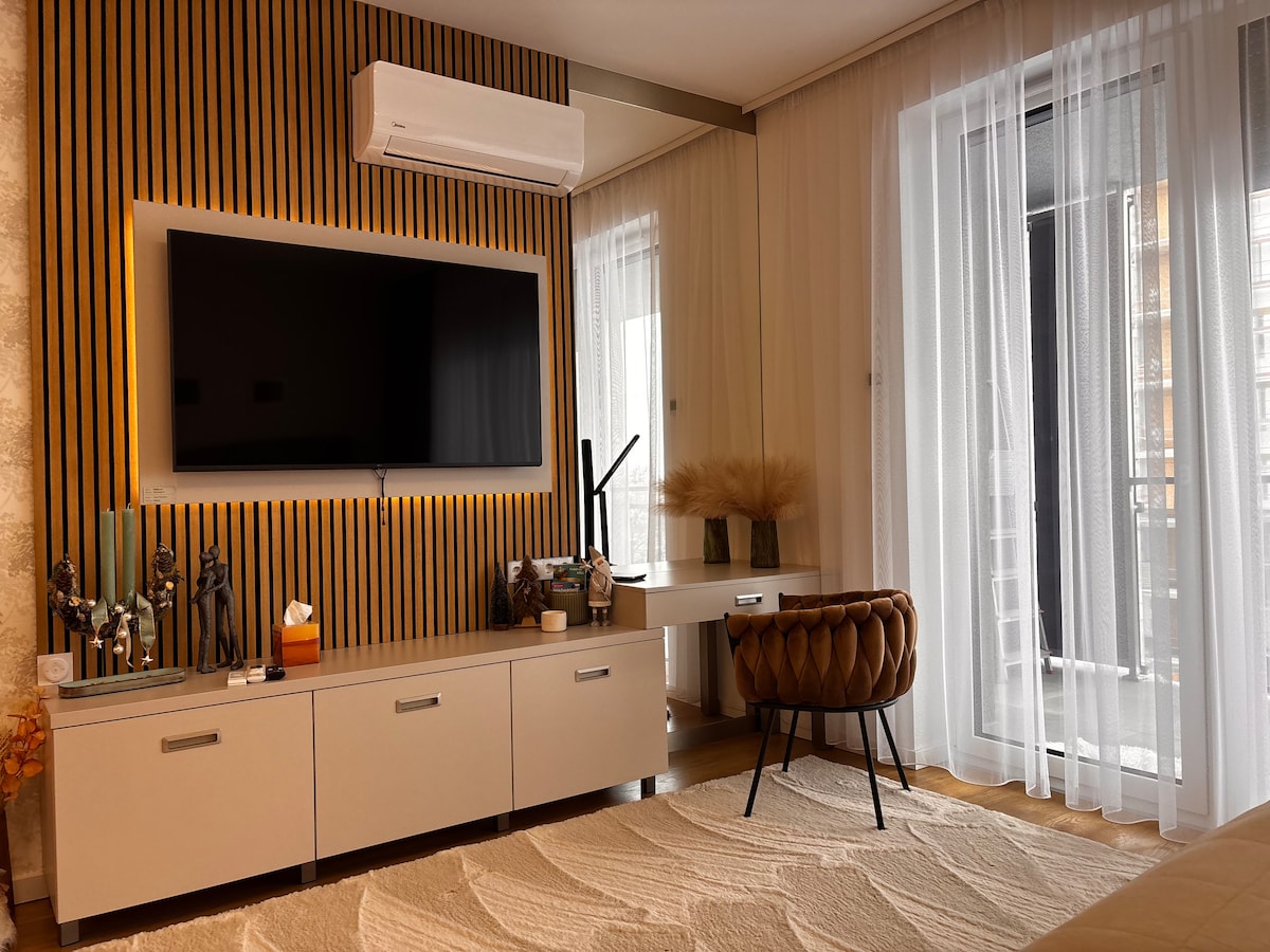 Located in a peaceful, quiet area, this bright, stylish apartment in a new building is perfect for families. Enjoy the spacious terrace, modern design, A/C, and elevator access. The building features a huge backyard and a playground for kids. With easy access to the city, you can explore while enjoying the tranquility of home. Ideal for a relaxing getaway, this space offers comfort and convenience for the whole family! Free parking in front of the building.