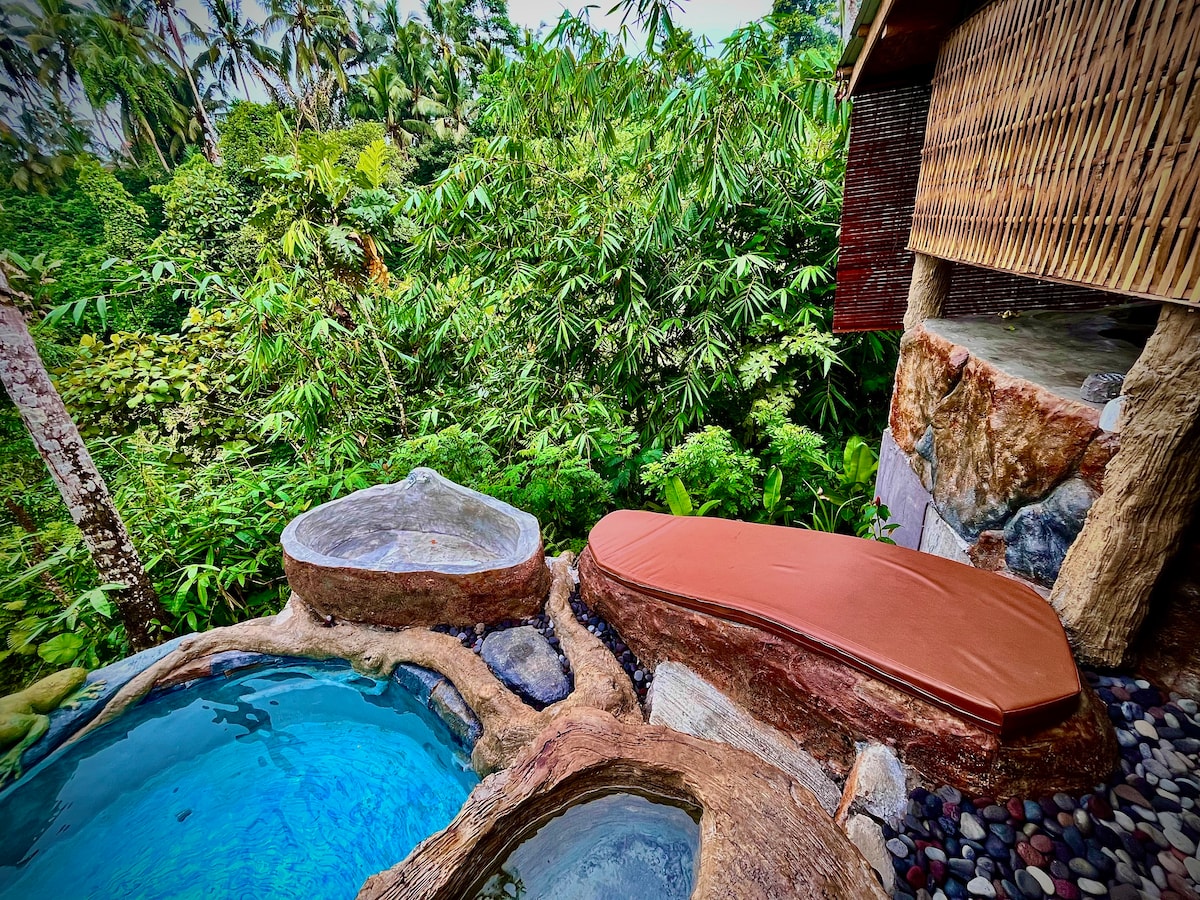 Experience luxe living in our Balinese tree house, nestled amidst the verdant countryside. This luxury cabin, resembling a tiny home, boasts an impeccable design that seamlessly blends with nature. Wake up to an amazing view of majestic mountains, right from your bed. Relax in the unique outdoor bathtub, surrounded by the serene whispers of the jungle. Feast on delightful BBQs on the private deck, set against a panoramic backdrop. Dive into the essence of Bali – where luxury meets the wild.