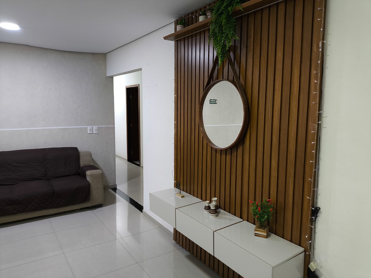 A casa tem automação pela ALEXA e possui dois quartos com Ar Condicionado, banheiro , cozinha completa e sala com Smartv e wifi por toda propriedade. Na parte de fora temos uma edícula com mesa grande , cadeiras, geladeira, churrasqueira e banheiro. Na área descoberta temos uma piscina e duas duchas. Garagem coberta para dois carros e pátio grande para mais 6 carros.