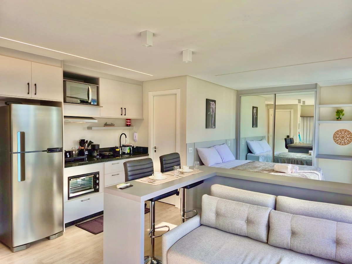 Studio de luxo completo no 29º andar, TV Smart grande, WI-FI, NET, ar condicionado, garagem coberta, piscina, academia, espaço kids, espaço para yoga/pilates, quadra de esportes, mirante, sala de sinuca, lavanderia, espaço de coworking, sala de estudo, mercearia e mercado, tudo isso dentro do edifício ao lado do Shopping Estação e de fácil acesso aos principais pontos turísticos de Curitiba. É ideal para casal, mas pode acomodar mais 2 pessoas no sofá-cama. Perfeito para aquele momento especial!