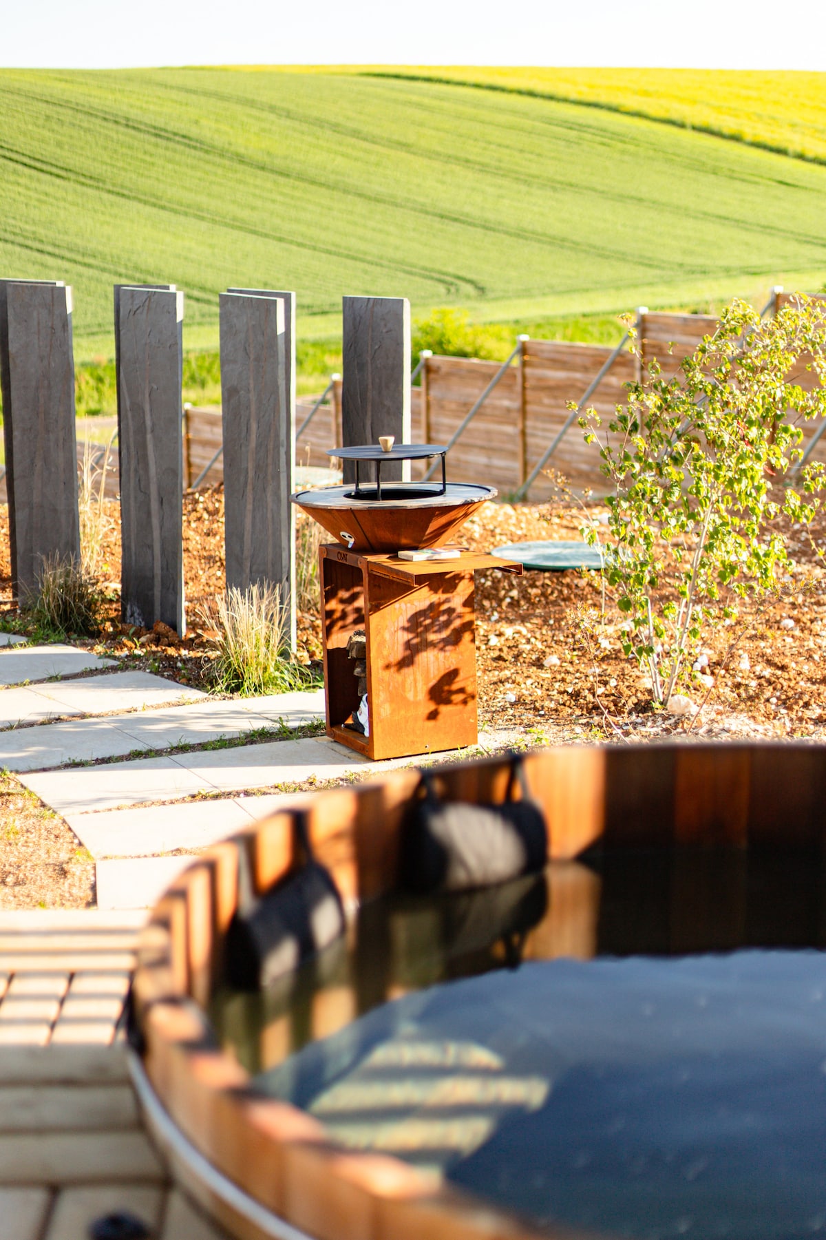 Nestled in the heart of nature, just 1.5 hours from Paris and 30 minutes from Troyes, Hestia is a luxury eco-lodge designed by an architect, accommodating up to 10 people. Surrounded by a landscaped garden of nearly one hectare, with its wooden hot tub, terraces, atmospheric fireplace, and sublime views of the fields, it's the perfect family or friends' retreat combining comfort, ecology, and well-being. Luxury in a natural setting.