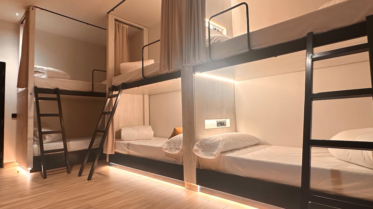Bed in a large bedroom with natural light. 2-meter-long bunk beds. Each bed has its own light, plug, USB socket, and shelf. Each bunk bed has a "blackout" style curtain for greater privacy, as well as a large individual drawer under the bed that can be locked with a padlock. (Can be rented at reception). They have: Air conditioning Heating High-speed Wi-Fi Shared bathrooms and showers in the hallway Blankets Bed sheet Towels (extra with surcharge and upon request) Coat hanger