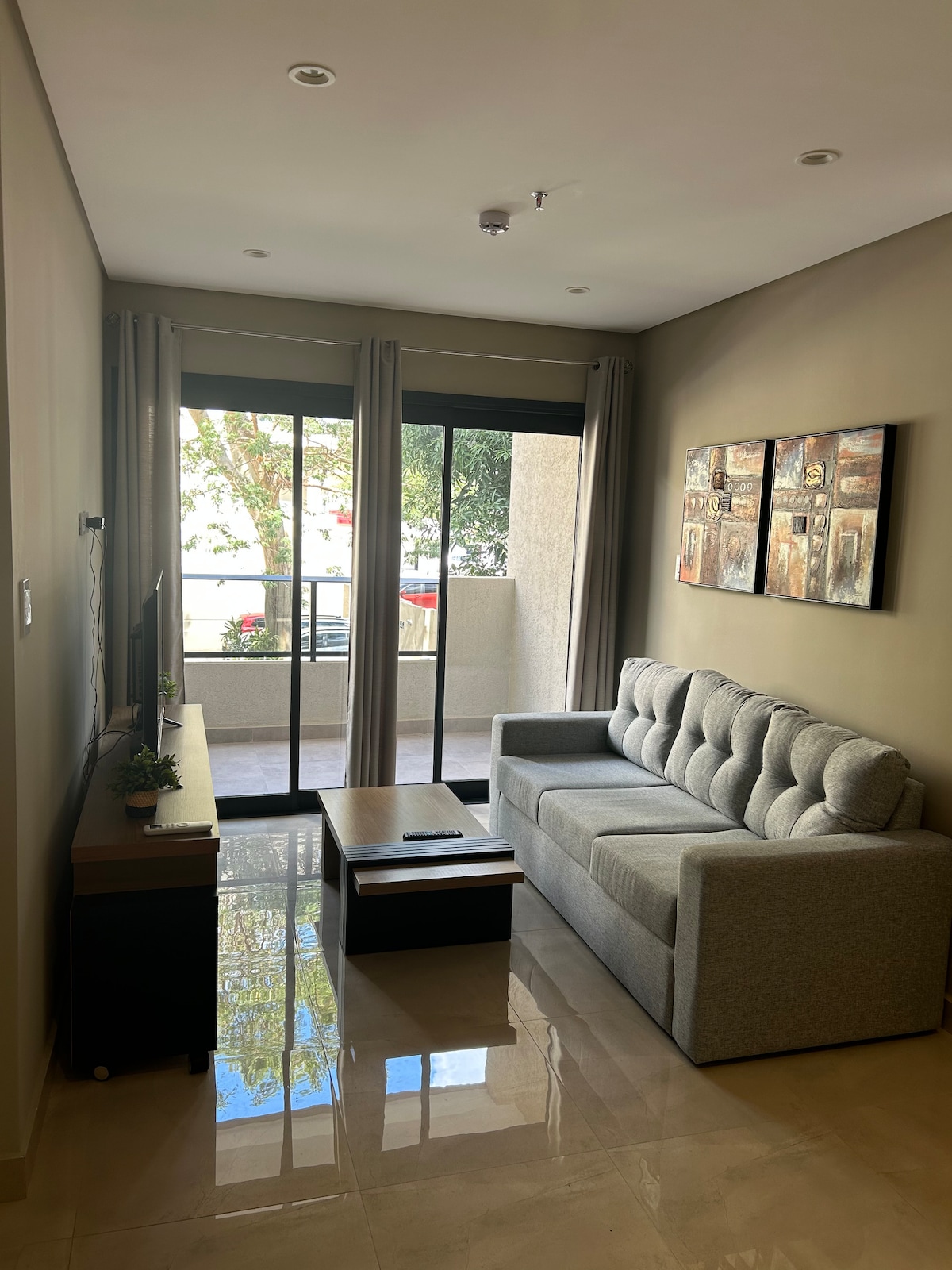 Beautiful 1 bedroom apartment with garage, fully equipped for long term stays. It is located on the fourth floor of a modern first class building, Tribeca Villamayor. Located in a very safe, residential area neighborhood, Manorá, walking distance from the main shopping centers, Shopping del Sol, Paseo de la Galería and WTC Asunción.