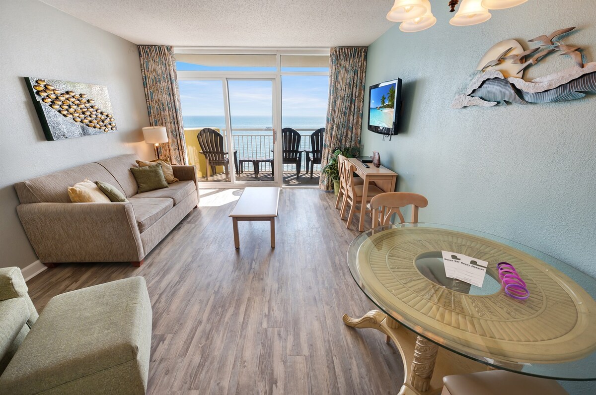 Modern coastal inspired design fill our 1-bedroom, 1-bath condo on the 15th floor at Beach Cove Resort. 🌊 🌴 Panoramic views from your balcony 🌴 King Bed 🌴 Direct beach access + use of 2 beach chairs 🌴 Access to all resort pools and hot tubs 🌴 Poolside Tiki Bar 🌴 Less than 5 minutes to Barefoot Landing, Tanger Outlets, Duplin Winery, House of Blues, Alligator Adventure, Mini Golf & more!