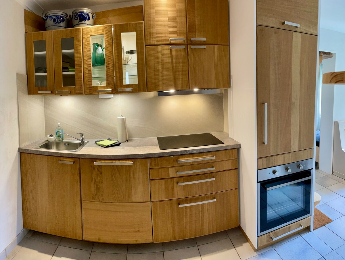 Our completely renovated and modernly furnished one-room apartment offers you everything you need for a comfortable and relaxing stay in a small space – perfect for couples, solo travelers or business travelers. The combined living and sleeping area is bright and friendly. Through the large wing door you have access to a small terrace where you can enjoy the sun overlooking the Upper Castle. 🏰