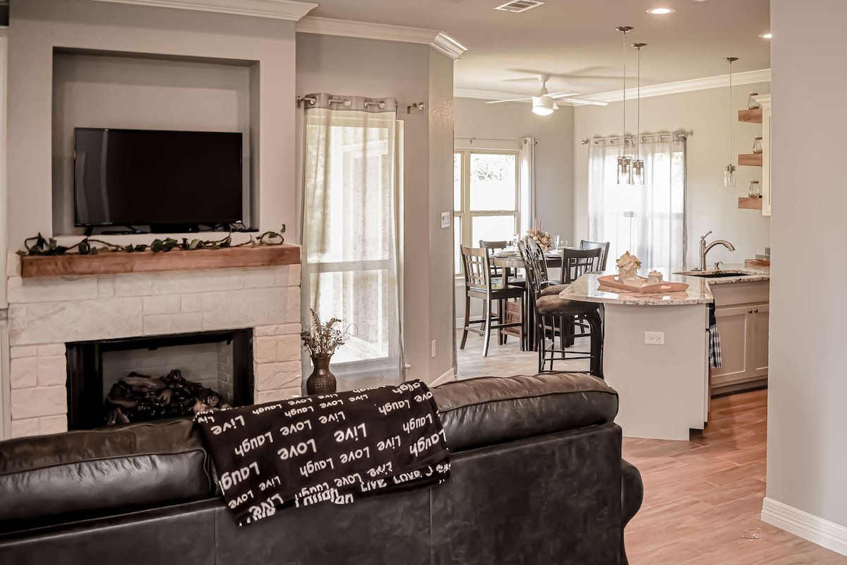 Modern Comfort Awaits in Fort Worth: Stay in this beautiful, newly constructed 2023 home! Spacious and contemporary, it features a large screen TV and cozy couches in the living room, which opens to a fully stocked kitchen with quartz countertops. Each of the three bedrooms offers a King or Queen bed and a flat screen TV. Enjoy dining under cafe lights or relax with a glass of wine by the patio fire!
