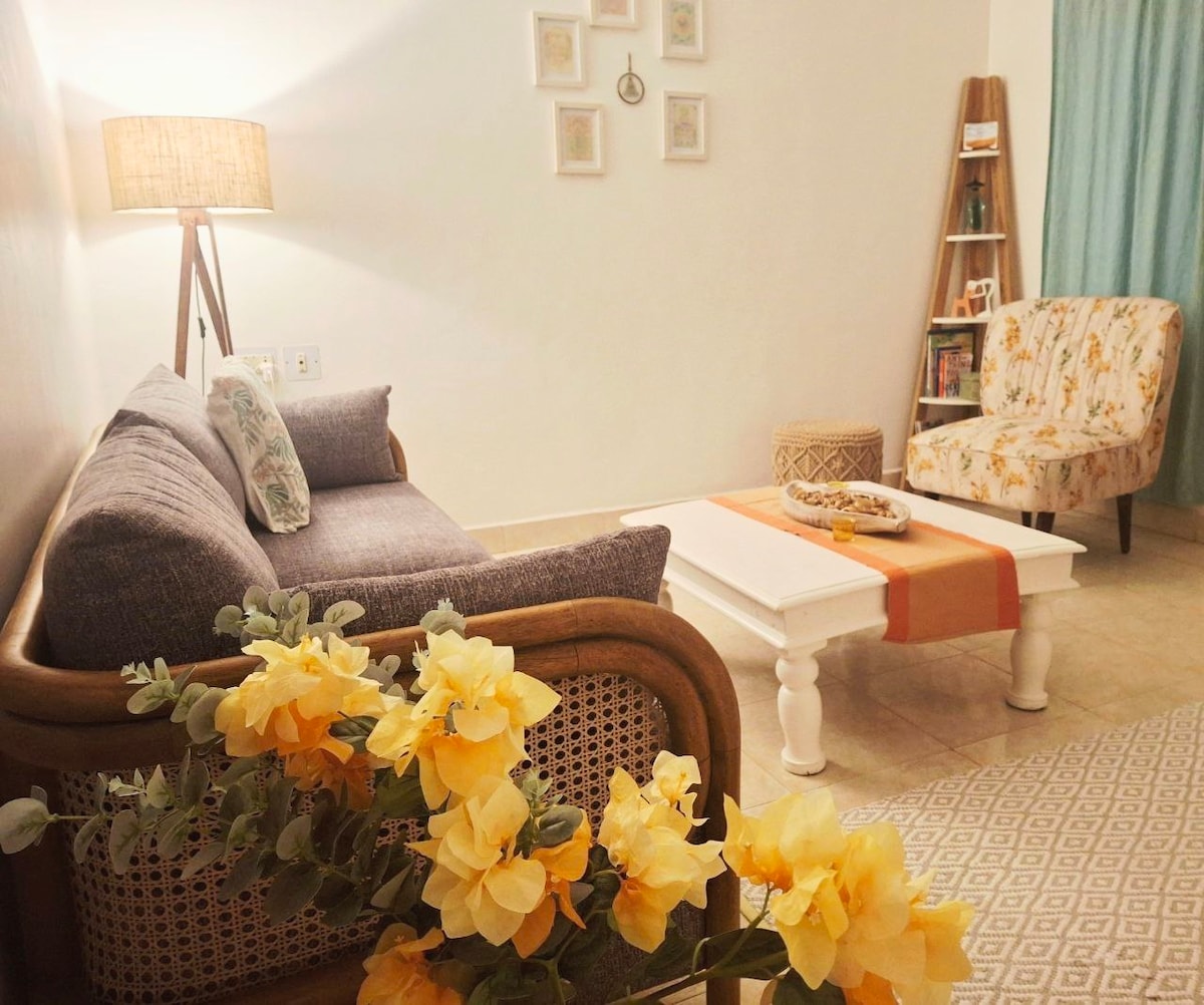 Certified by Goa Tourism 950 sq ft air-conditioned apartment: 2 bedrooms, 2 bathrooms, TV/living room, open kitchen; laundry nook + 500 sq ft non-air-conditioned space: dining for 4; sunroom sit-out; shaded patio; open-air balcony 300mbps internet; 4-5hr power backup; 50" Smart TV; books; board games; workstation & covered car park Located in Porvorim: 15min Panaji/Mapusa; 25min Calangute/Baga; 30 min Anjuna/Vagator; 45-60min Ashvem/Mandrem/Arambol; 60-75 min South Goa beaches; 120min Palolem