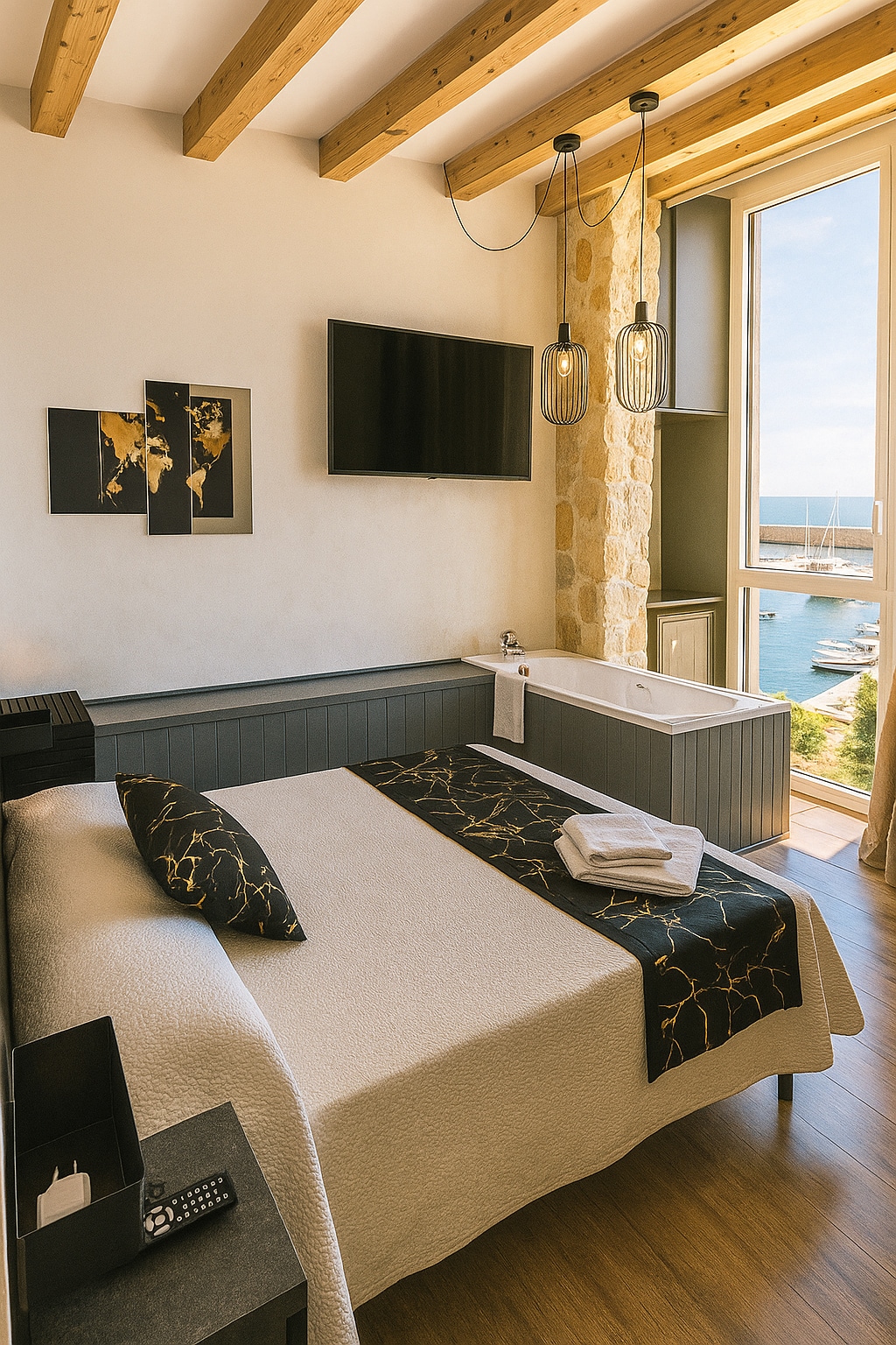 La nostra suite dispone di ogni comfort moderno, tra cui aria condizionata, TV a schermo piatto, minibar e connessione Wi-Fi gratuita. la nostra camera vi permetterà di trascorrere piacevoli momenti in compagnia, mentre il letto vi garantirà il massimo riposo grazie al comodo letto king-size. Il bagno privato, dotato di doccia, vi regalerà momenti di assoluto relax e benessere. La camera dispone anche di una piccola vasca con la vista panoramica al porto di Mola di Bari