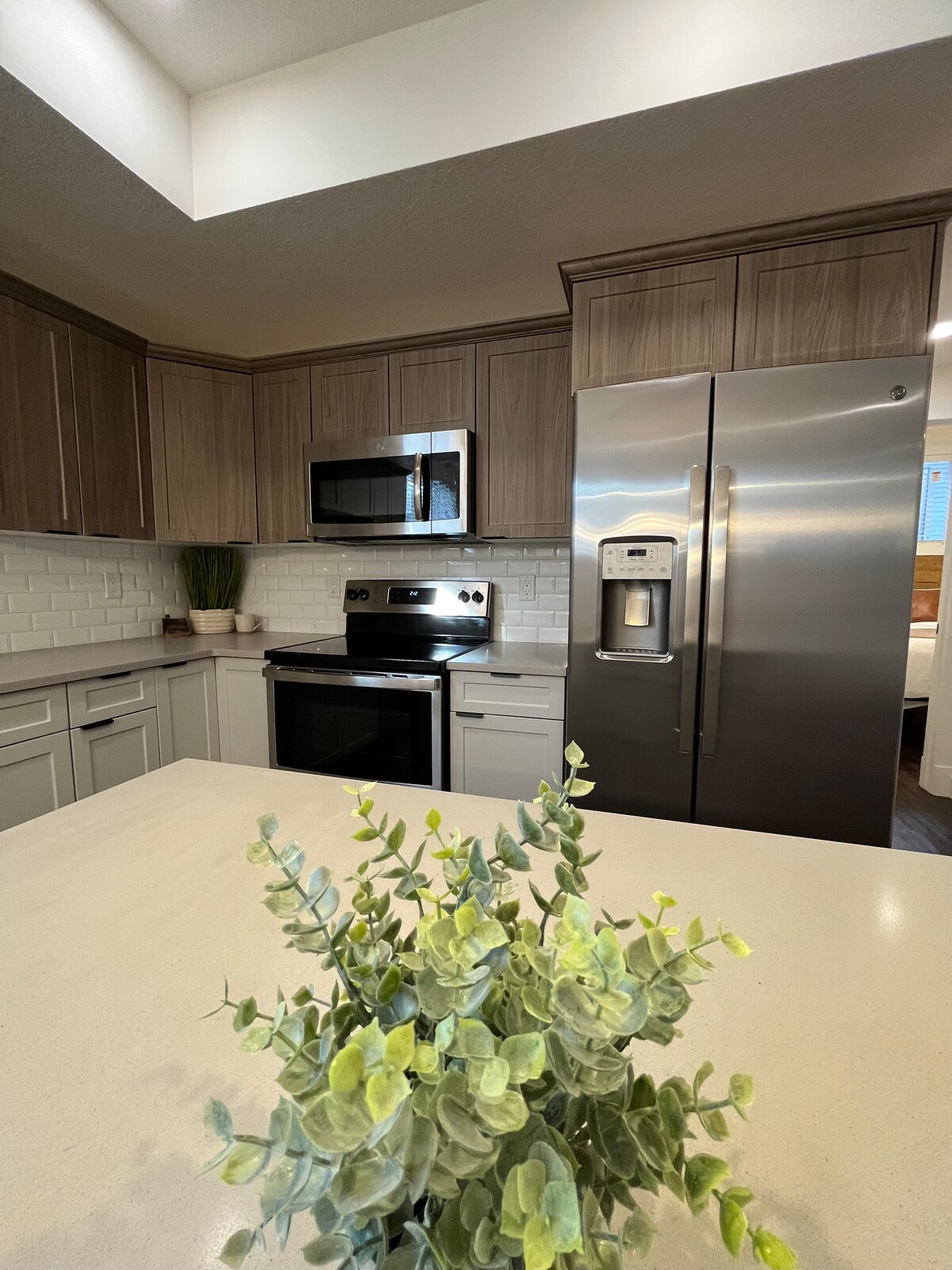 Cozy home away from home in Grande Prairie! This spacious upper suite features 3 bedrooms, 2 bathrooms, a fully equipped kitchen with stone countertops, a dining area, and a living room with Roku for streaming. The master suite has a queen bed, ensuite, and walk-in closet, while two more bedrooms have double beds. Enjoy private laundry, Wifi, driveway parking, a large deck with stunning countryside views, and a prime location near shopping, dining, GP Hospital, and the airport on the West end.