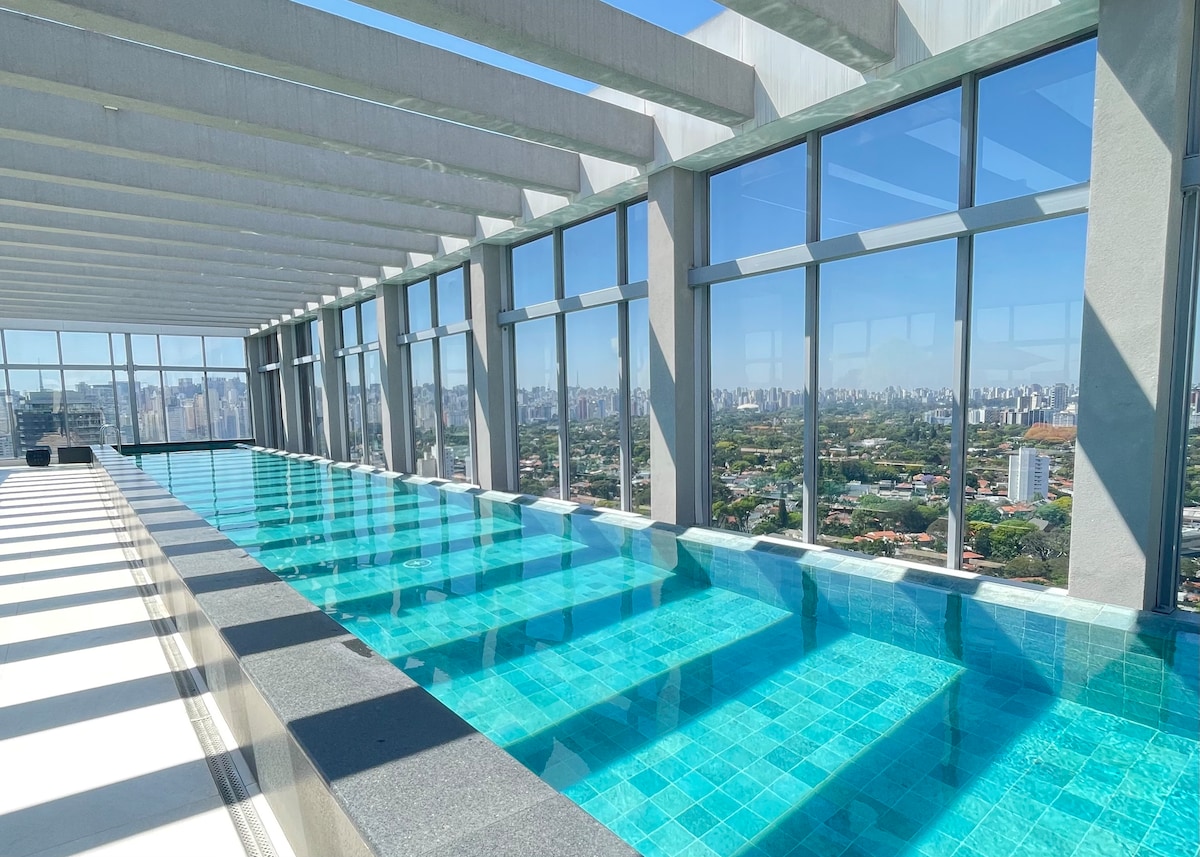 This beautiful property is in an award-winning building that has been on the cover of VEJA twice, and among the properties, this one stands out! Located in Pinheiros with an eternal view of the green of Jardins. Close to the mall, Avenida Paulista, parks, restaurants and more. With renowned restaurants, a rooftop, a gym and an infinity pool, and two parking spaces available. You'll be super welcome for an amazing stay Mobilidade Subway, bus corridor, electric scooter (Locar) and everything nearby.