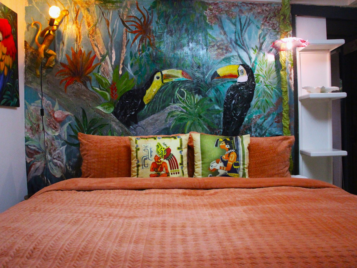 This air-conditioned mini-sized wooden cabana on stilts is attached on one side to another "One World" rental unit. It has its own entrance and a pretty outside sitting area, complete with hammock. Inside the building you will find a comfortable twin bed with a bedside table as well as a toilet, wash basin and shower, separated from the sleeping area only by a curtain. This place is perfect for an uncomplicated traveler who needs a clean, basic space in a great location right in town!