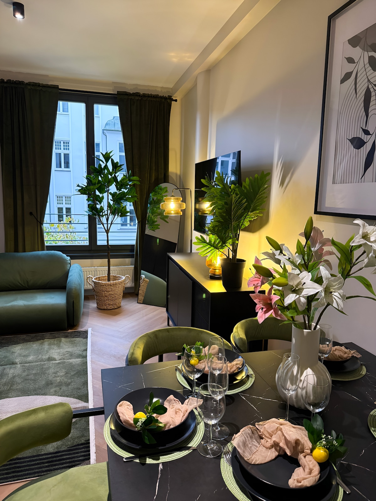 Welcome to this spacious and elegant private suite in the historic heart of Berlin, just a short walk from the city’s most important landmarks, excellent restaurants, and vibrant shopping areas. Enjoy complete privacy, peaceful garden views, quiet sleep, and refined modern comfort. Floor to ceiling windows fill the space with natural light, while a luxurious king size bedroom, a high-end kitchen, and a sleek bathroom with a rain shower and bathtub create a calm retreat in the middle of the city.