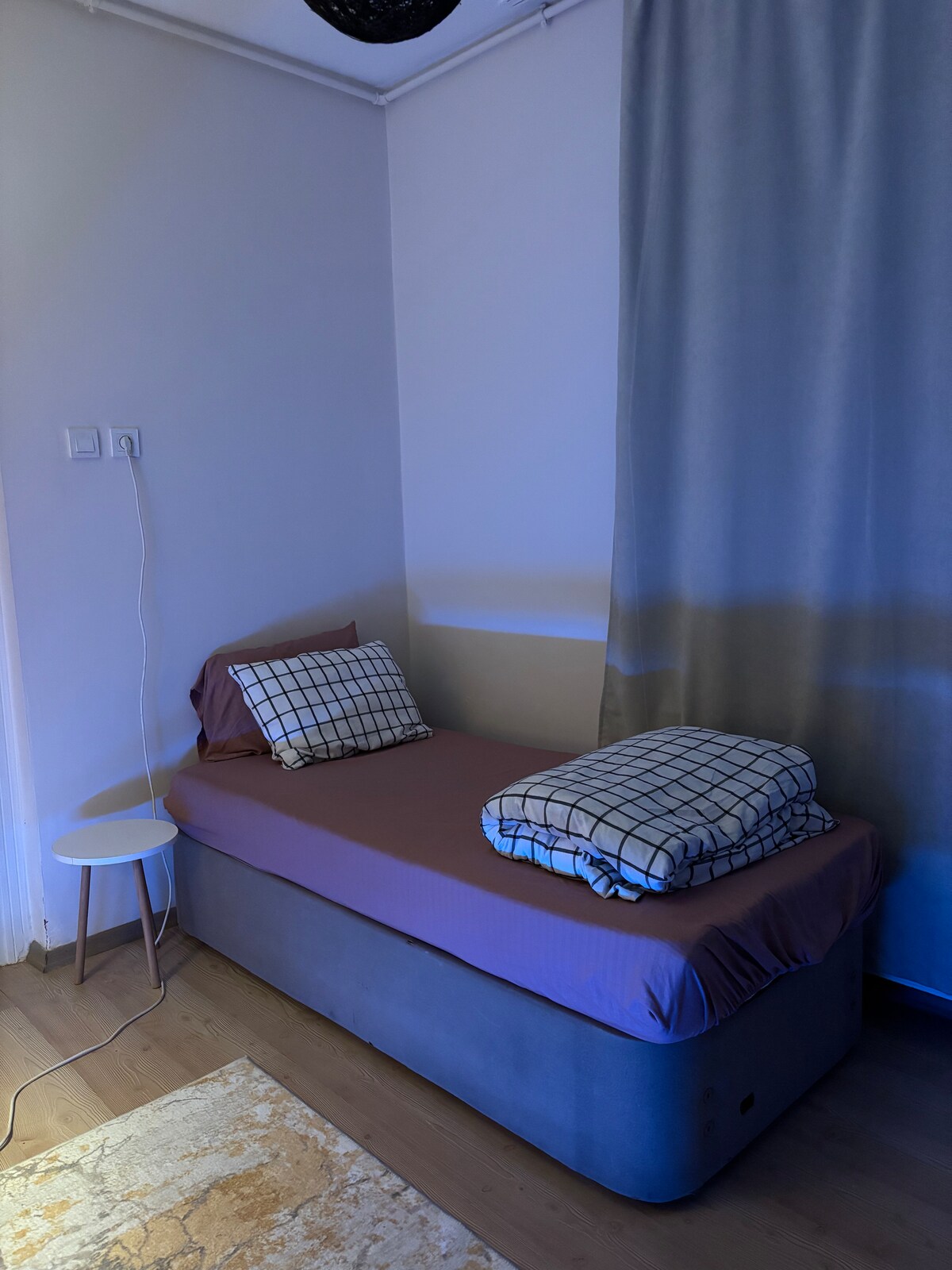 Our room is luxurious, modern and carefully designed. Located in our hotel, this room has a large double bed, a 43-inch smart television and a private bathroom. Our room has a small kitchen with a mini fridge and small kitchen supplies. Our room is on the 3rd floor. There is a 24/7 camera and security system. The exterior door of the building is specially coded and protected. Our room is designed to accommodate 2 people.