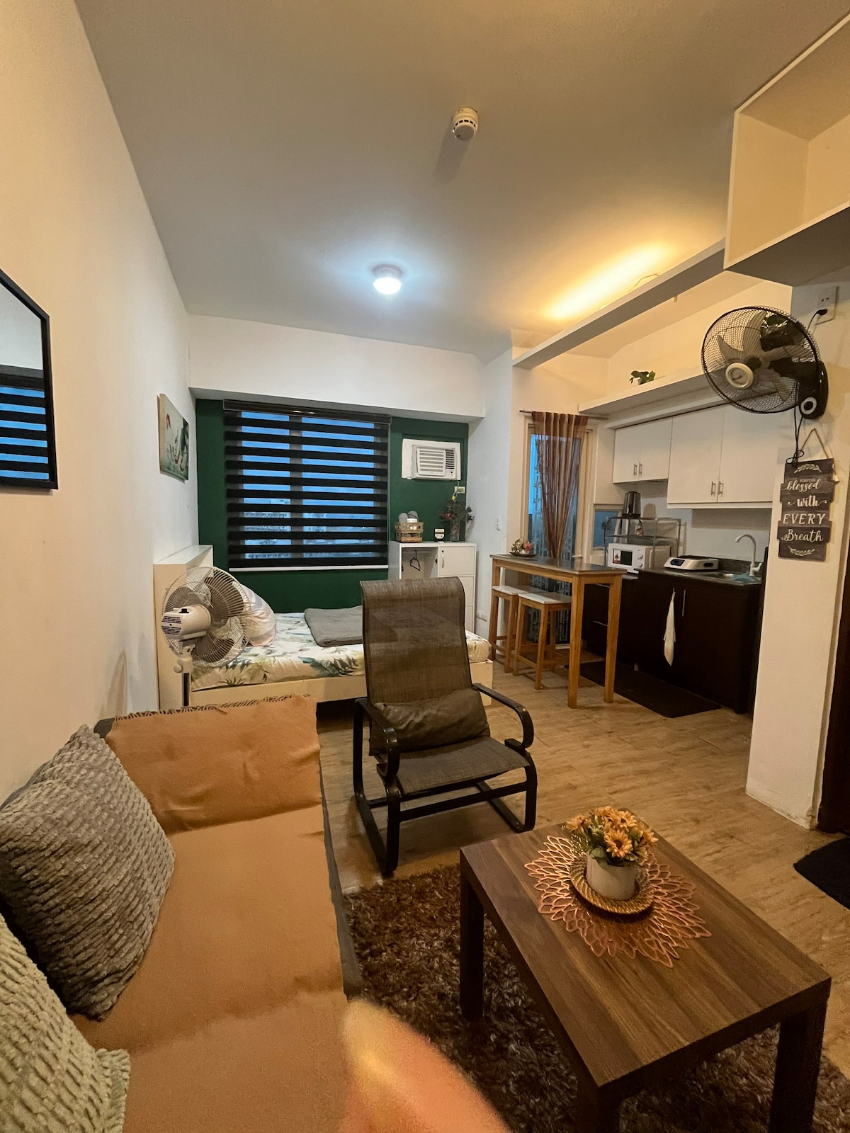 Stay in the center of the action in this one-of-a-kind place. Near to everything that you need. A very nice place to stay, hangout or just chill. * Aircondition * 65-inch TV * Soundbar Speakers w/ Subwoofer * WiFi * Air Purifier * Bed Size Double 54x75 * Pull-out Bed size twin KITCHEN * LG Refrigerator 7cuft. * Induction Cooker * Microwave Oven * Electric Kettle Pots & Pans * Kitchenwares & Utensils * Dinnerware BATHROOM * Single Point Water Heater * Fully Automatic Washing Machine