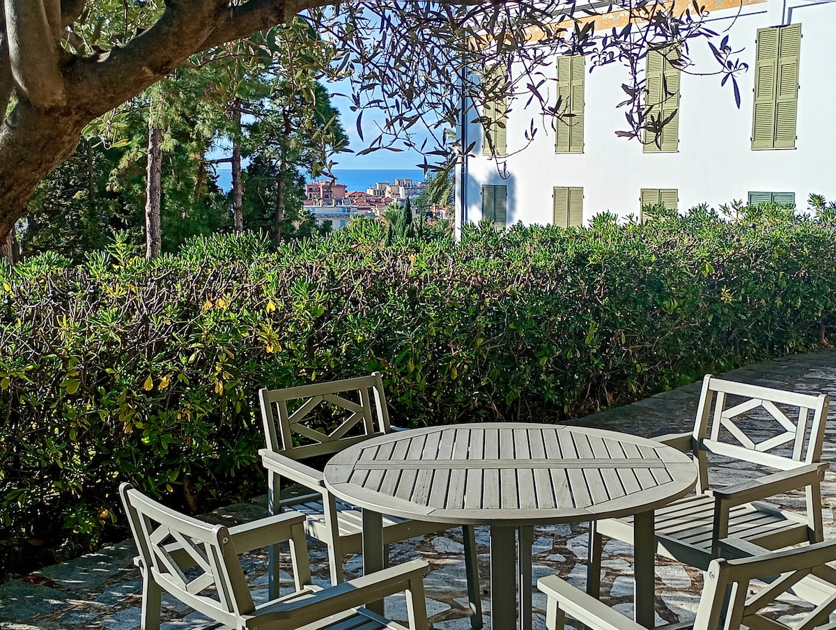 Elegant appartment in Bordighera with private garden. It is located in the Belvedere Hanbury a liberty building. The living room, with open kitchen and comfortable sofa bed, creates a cosy and functional space. From the bedroom there is access to a large terrace, connected to its private garden, ideal for enjoying peaceful moments in the open air.This is completed by an elegant bathroom with shower.Just a few minutes walk from the sea and the centre, perfect for your stay. Private parking space