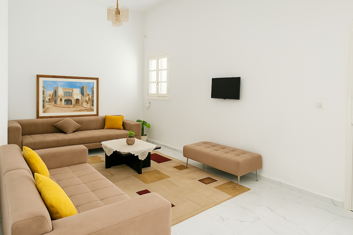 Welcome to Dar El Ons, a modern and comfortable house located in the quiet area of La Mansoura, minutes from the historic center of Kairouan. Its style combines contemporary design and Tunisian touches, creating an atmosphere that is both warm and peaceful. Whether you're traveling with family, friends or on a spiritual visit, Dar El Ons offers a welcoming space where you'll quickly feel at home.