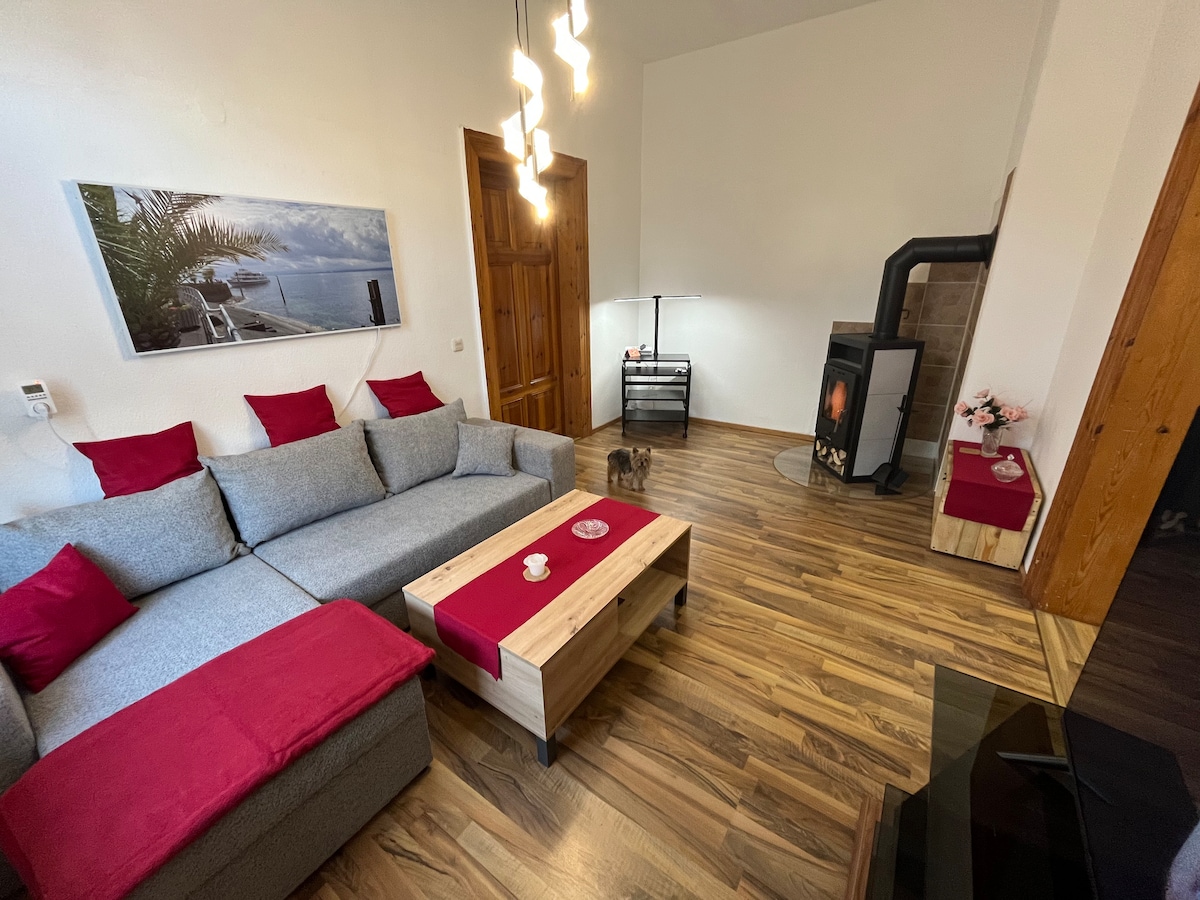 30 sqm apartment in renovated two-family house Entryway Main room 1.60 m bed, couch (with sleeping function 1.30 m wide), dining table designed as a sideboard Kitchen fully equipped (premium appliances, coffee, tea, drinking chocolate for free) opposite double washbasin left of it entrance to the open rain shower to the right of it toilet (lockable door) el. roller shutters main room & toilet Pleats on all windows Vehicle(s) can be parked directly in front of the property (cul-de-sac)! Yard not yet renovated