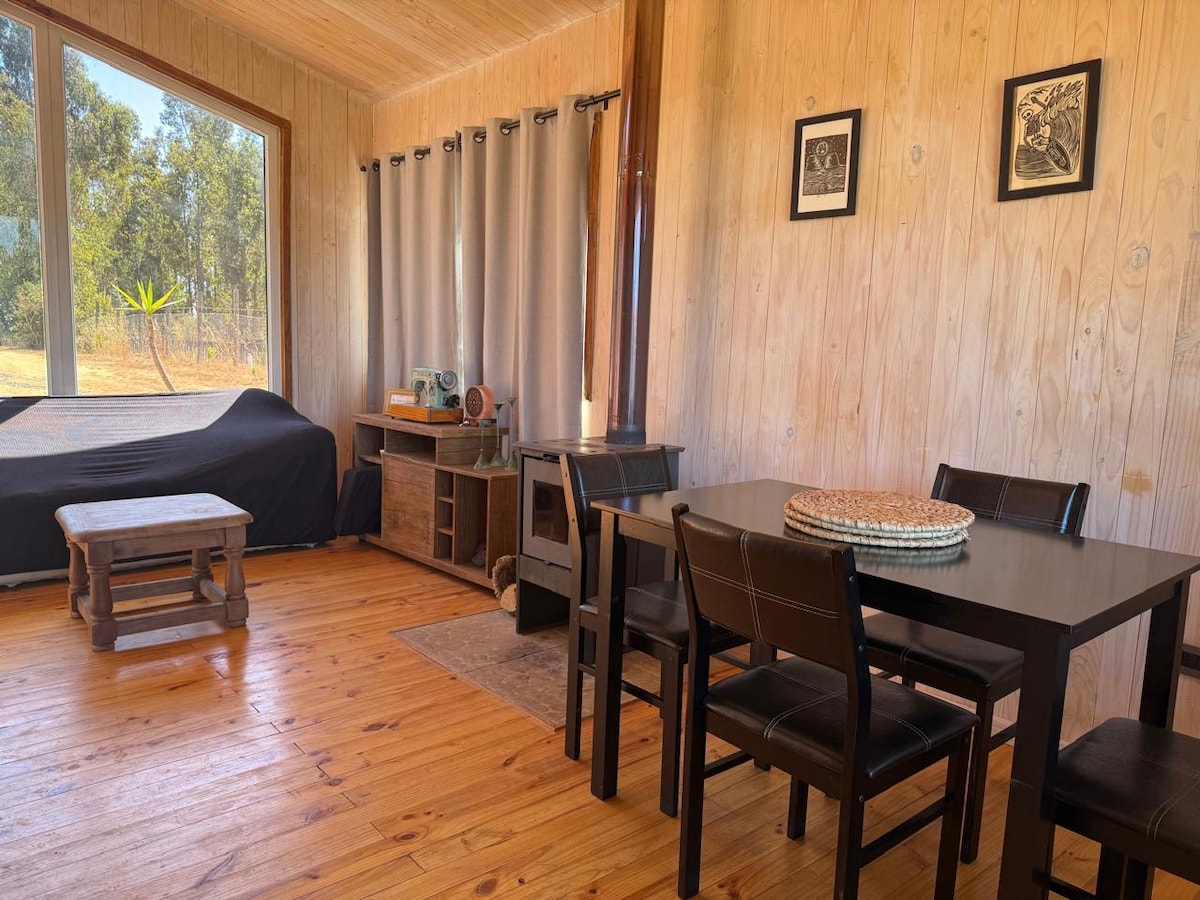 Relax in this quiet and elegant space, Bush Lodge is located in Cahuil-Pichilemu, just 5 minutes from Cahuil Lagoon and 10 minutes from Punta de Lobos. A cabin immersed in a eucalyptus forest, ideal for disconnecting from routine and stress. It has: - Tinaja and private terrace - Grill - 2 Bedrooms - Equipped kitchen - Heating - Starlink Internet - Sheets and towels - Private bathroom - Private parking