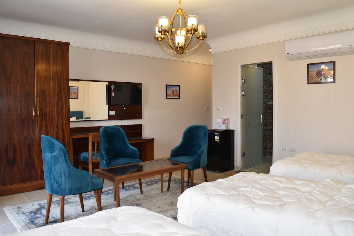 The room is about 30 square meters, everthing in the room is new and with high quality, and the general atmosphere in the room gives you a feeling of comfort, and the room has a private toilet and it's own heritage with pyramids view where ( 20 square meters), and there is free internet service in the room and a small refrigerator. There is also a great heritage with pyramids view where can eat food and drinks, enjoy the sun during looking at the pyramids