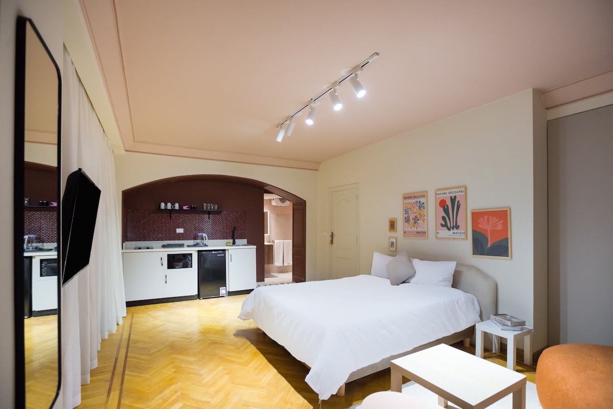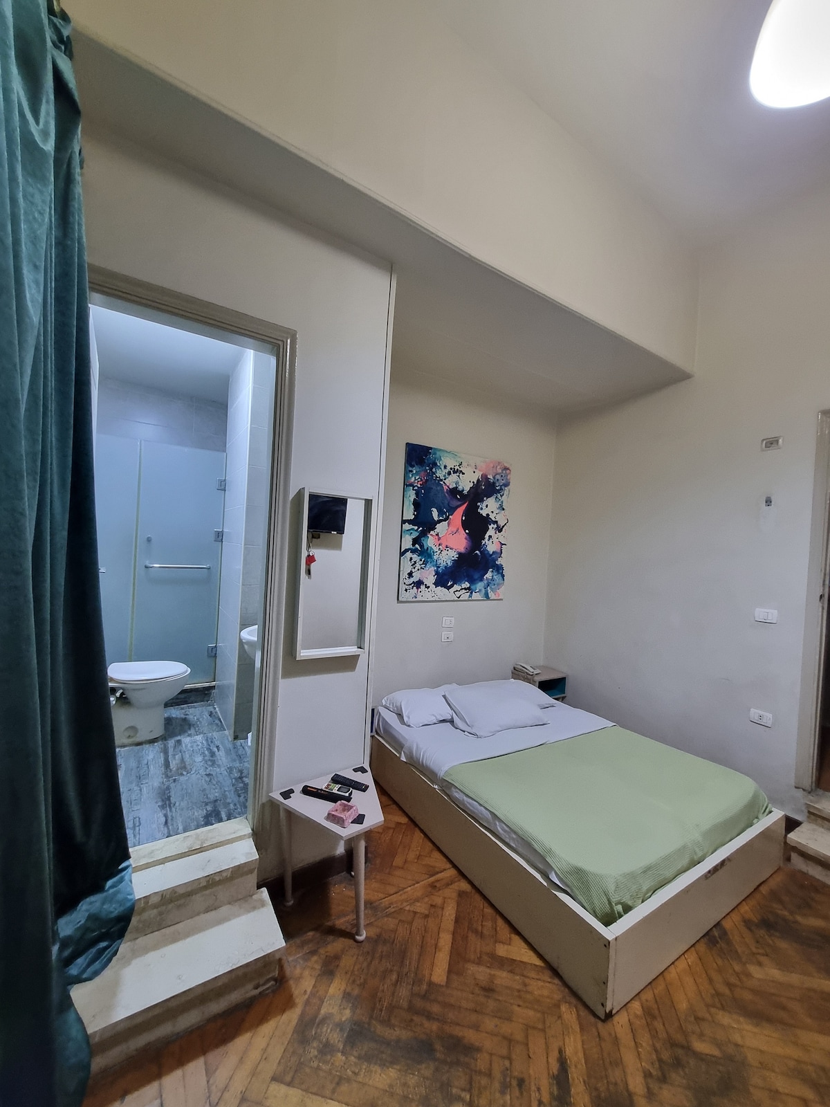 Experience comfort and elegance in our spacious room, featuring two cozy beds, a plush sofa, and two inviting chairs. Enjoy air conditioning, high-speed WiFi, a flat-screen TV, and a fan. Step out onto your private balcony to soak in the vibrant sights and sounds of downtown Cairo. Indulge in our vintage dining room and living space with precious furniture, and cook in our fully equipped kitchen. Your perfect home base for exploring Cairo awaits. Book now and make unforgettable memories!
