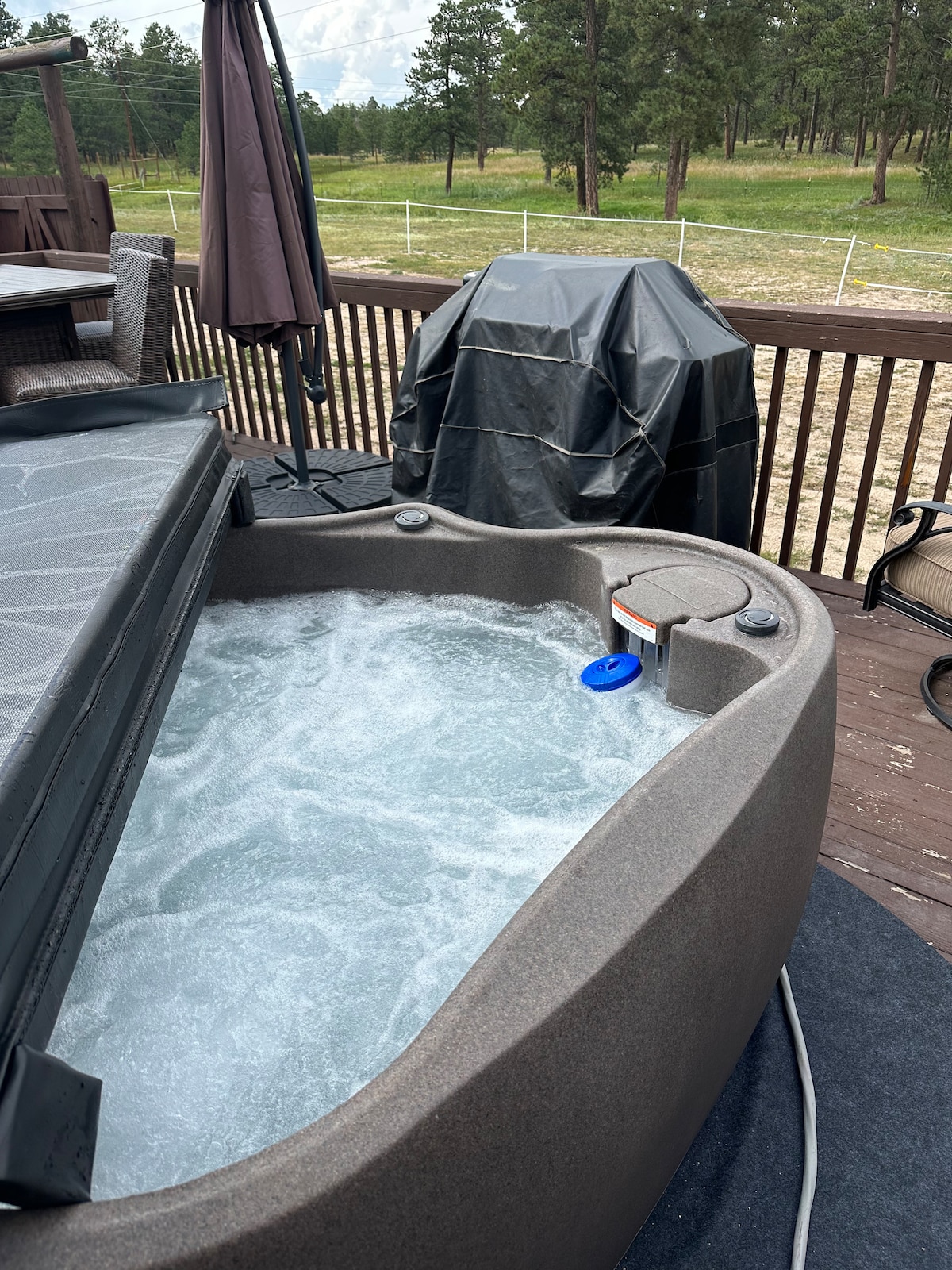 1000 sq ft new house on the edge of Colo Springs. Full Kitchen TV-QLED 55" TV (Rolls to LR, BDRM & spa) 100M fiber Internet Private Spa: Perfect couples retreat Open Air shower 2 pers unique hot-tub/bathtub. 1. Fill to any temp (110F max) 2. temp +/- on the fly 3. Bathe 4. Drain - No Chems Shares 10 quiet acres with 1. 2nd 2-person Airbnb 2. Main House - (Judy & I) Buildings are separated-Lodge is private Trails (on property & state trail close by)