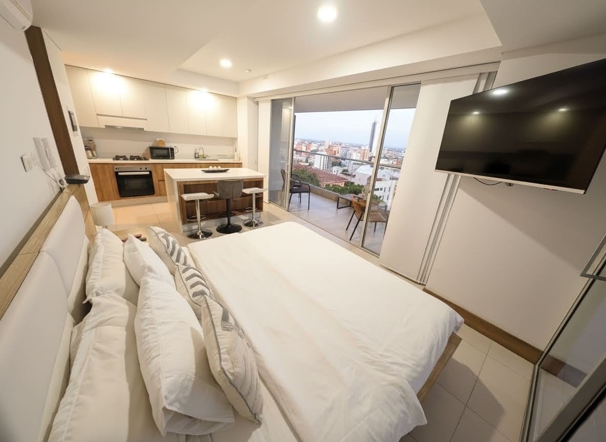 Luxury penthouse studio in Cali’s vibrant Granada district with stunning city views. Ideal for solo travelers or couples. Sleeps up to 3: queen bed, mid-size sofa bed (80x160 cm). Enjoy full kitchen, in-unit laundry, terrace, plus access to pool, gym, spa, coworking, and meeting rooms. Enhance your stay with salsa classes, eco-tours, whale-watching, and optional private chefs, drivers, and massage therapists—all curated just for you. RNT: 251456