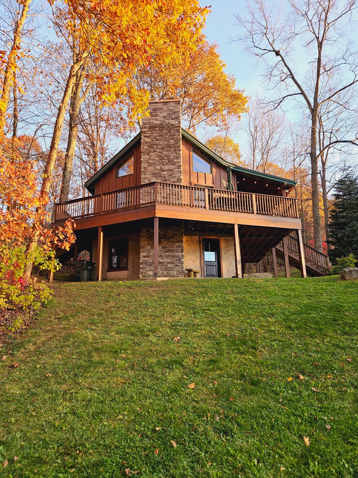 Come and visit our clean and cozy one bedroom cabin in the wooded hills of Guernsey county Ohio and relax on the spacious deck and listen to the sounds of nature, take a trail walk on the 19 acre property, or stay inside and ask Alexa to play your favorite tunes or stream a blockbuster movie on the 65" 4k UHD TV with 7.2.4 Dolby Atmos surround sound, the choice is yours.