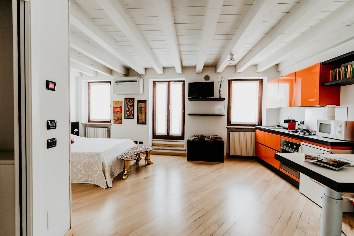 Attic in the Historic City Center – Steps from Verona Arena. Stay in the heart of Verona’s historic center, close to the main cultural attractions. This two-level apartment features a spacious master bedroom with a king-size bed and high-quality topper, along with a stylish bathroom with luxury toiletries.Upstairs, enjoy a bright open-space area with a fully equipped kitchen and elegant lounge.