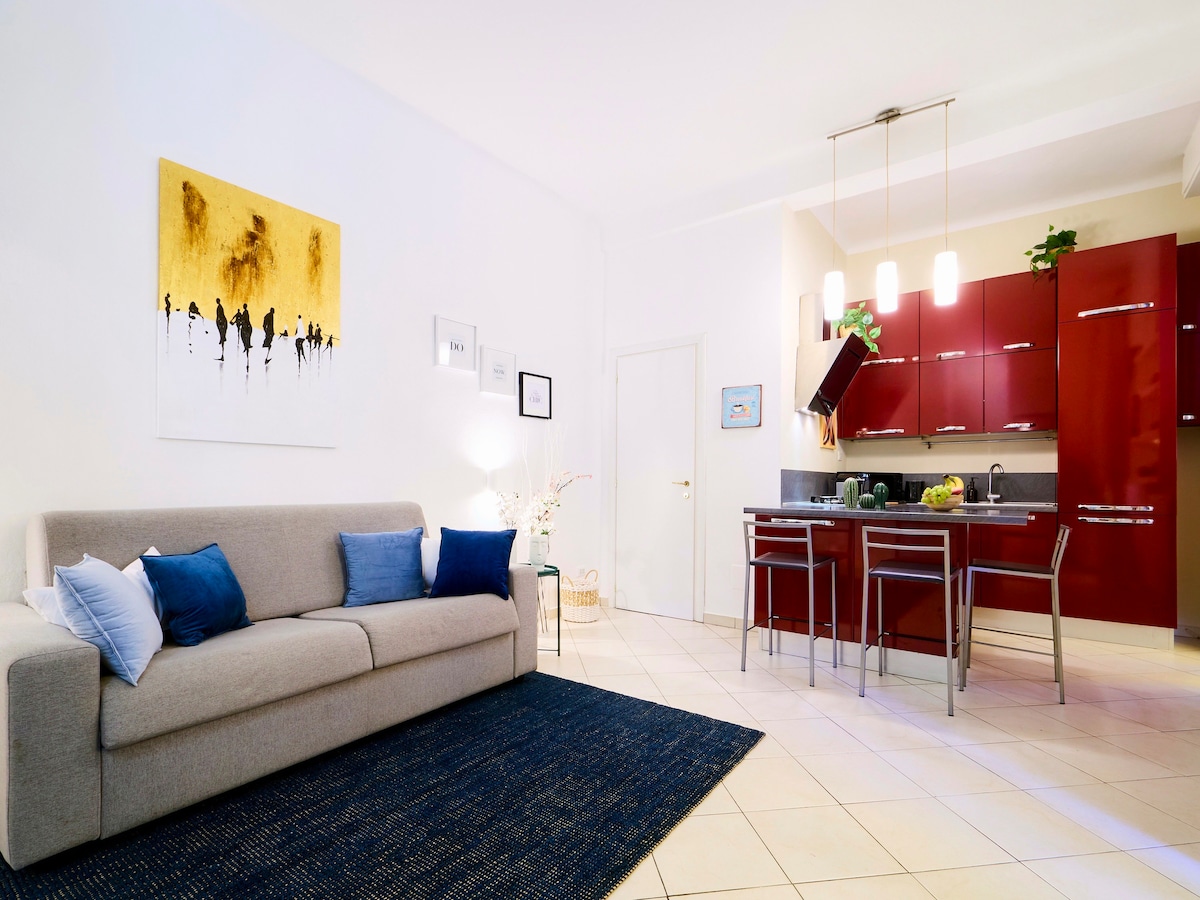 A newly renovated apartment where vintage, retro and colonial styles mix. A stone's throw from the Central Station, in an early 1900s Liberty building, we host you in a three-room apartment with a Bohemian touch: large, bright and elegant, where refined materials cover the floors with Carrara marble and Teak parquet, round arches create niches in the walls and synergies between the rooms, turquoise Moroccan zelliges cover the bathrooms and meet warm enamels in ultramarine colours.