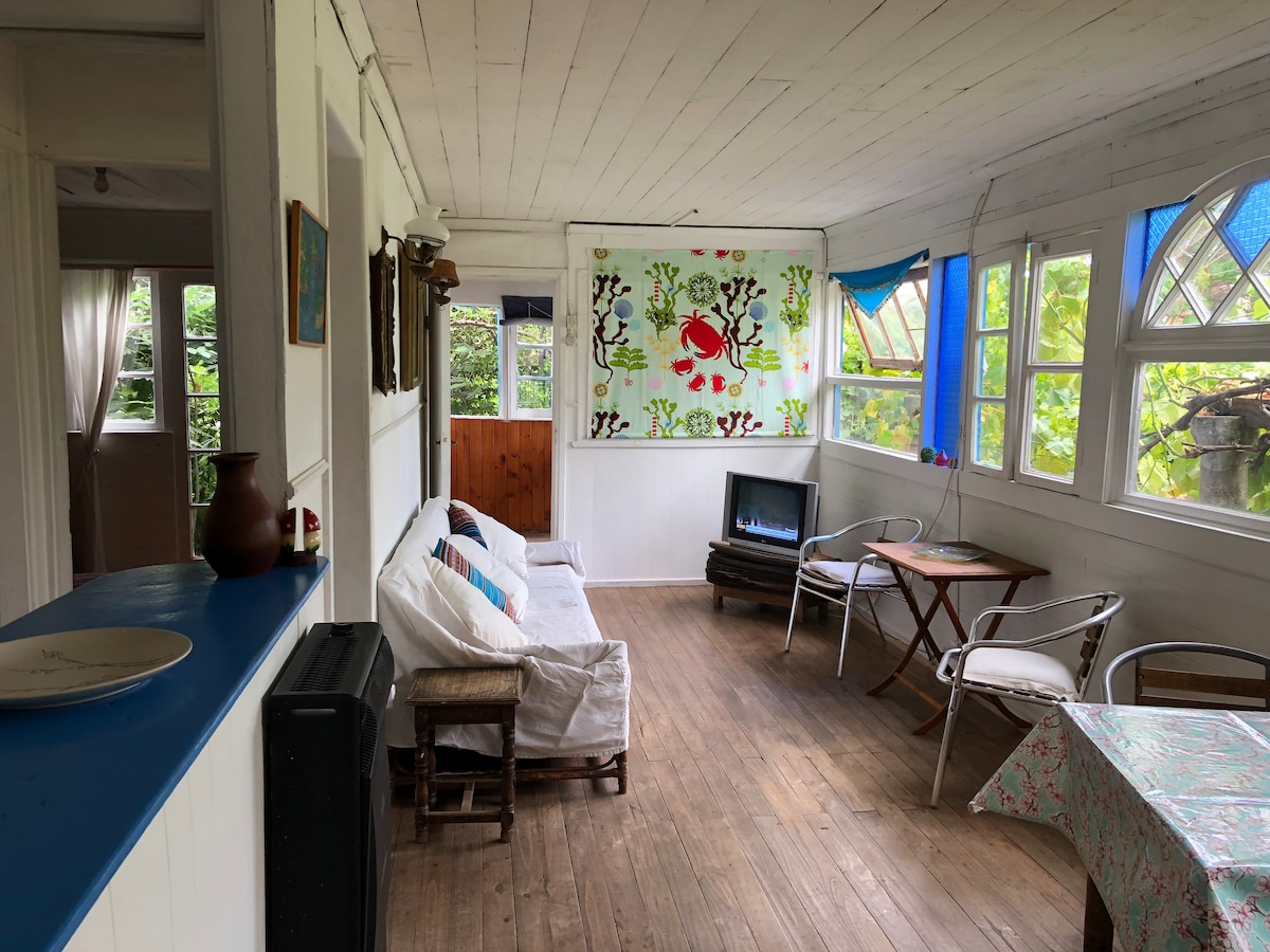 Beautiful heritage house with unbeatable ocean and hill views, in downtown Valparaíso. Quiet neighborhood, ideal for visiting the city on foot. The house is part of a remodeled heritage house. It has private access, a terrace, a living room, a dining room, a kitchen, 2 bedrooms, and 1 bathroom. It has beautiful views from all over the house. In addition, it has a sofa bed, dining table and work desk. The kitchen is very well equipped. It has a large terrace and garden.