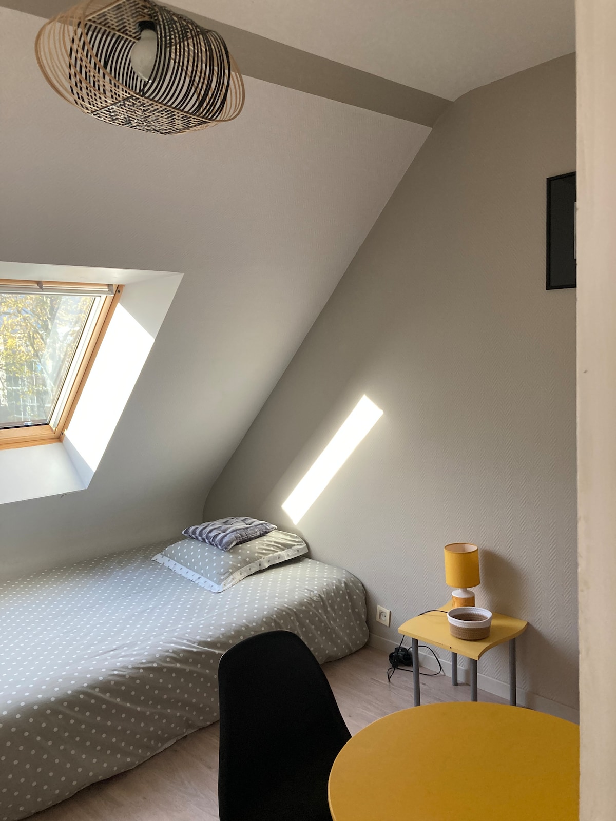 The loft was completely renovated in 2016. Quiet, it is located in a wooded park 8 km from Rennes airport, St Jacques de la Lande exhibition center and Ker Lann. It is accessed via an external metal staircase. The loft consists of an entrance with fitted and equipped kitchen, a living room with a large bay window overlooking the park, TV and dining area. A sleeping area with a 160 x 200 bed, a shower room and separate toilet.