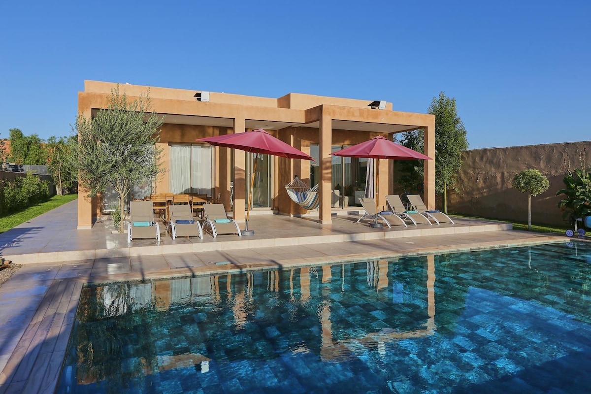 In a beautiful, secure, green and quiet area, including a tennis court and a SPA, located 25 minutes from the center of Marrakech, is villa 4, comprising 5 bedrooms, with its walled garden not overlooked and its private 60 m2 swimming pool. The carefully decorated villa will amaze you with its blend of traditional and modern. We offer a French-Moroccan breakfast package at 5 euro/person/day or the services of a cook No pets allowed