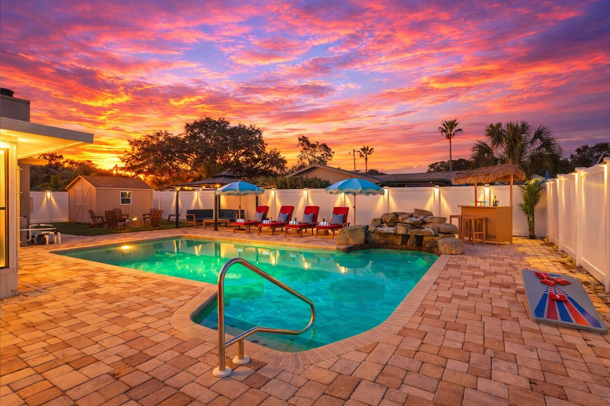 Heated Pool 8 min to beach w/ games, firepit, tiki