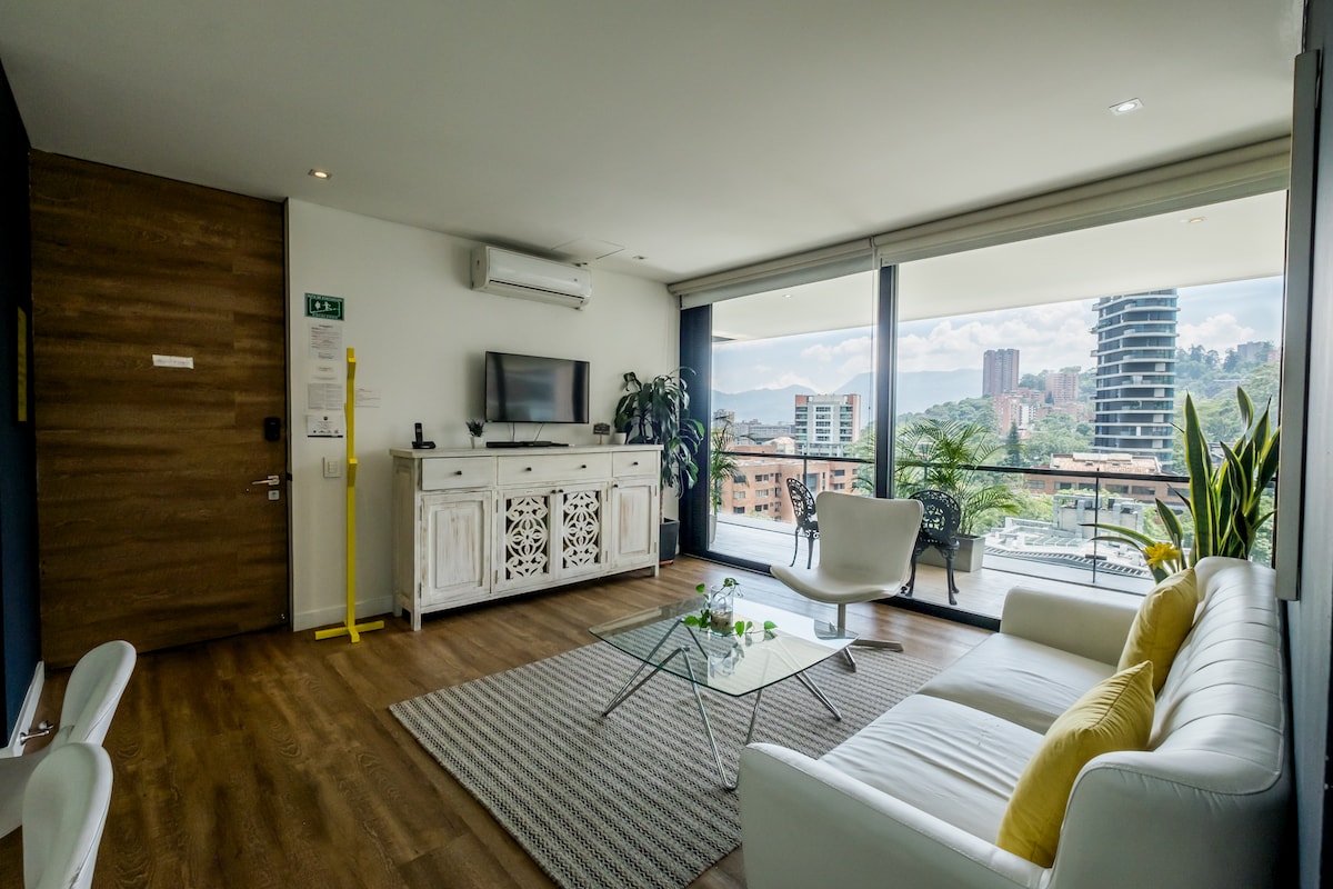 Brand new building (Hotel Urban Studios) & luxury apartment located in the best sector of El Poblado (El Tesoro), is perfect if you are looking for a peaceful and beautiful space. - Luxury interior design, furnishings - Spectacular views from Living Room, Bedroom, & Office - Full Washer & Dryer - Air conditioner In the Bedroom - 55¨Smart TVs LG - 200GB+ Wifi - Heated Pool & Jacuzzi - Steam Room - Complete modern gym - 24-hour security