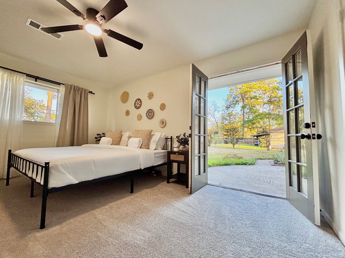 Stay 5 Min from The Woodlands in this one-of-a-kind retreat next to the Jones State Forest. 1/2 mile to walking, biking, or horseback riding on forest trails. At night you’ll gaze at twinkling constellations poolside or relax in our massage chair or jetted garden tub. Attend an outdoor concert at the nearby Cynthia Woods Mitchell Pavilion, one of the top amphitheaters in America. We are 5 min from The Woodlands Medical Center, and 10 min from The Woodlands Mall where you can shop till you drop.