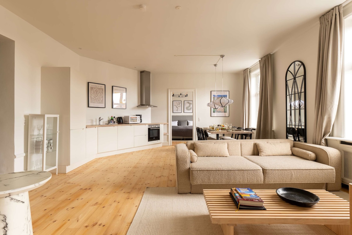 Welcome to Le Nord Suites – Mayor Suite, your luxury apartment with 4 sleeping spaces. Enjoy Scandinavian design, perfect for business or leisure, near Tivoli, City Hall Square, Kongens Nytorv, and Nyhavn. Two bedrooms with double beds, a modern kitchen, elegant bathroom with guest toilet, and a spacious balcony. Enjoy easy transport, sightseeing, and top dining just around the corner!