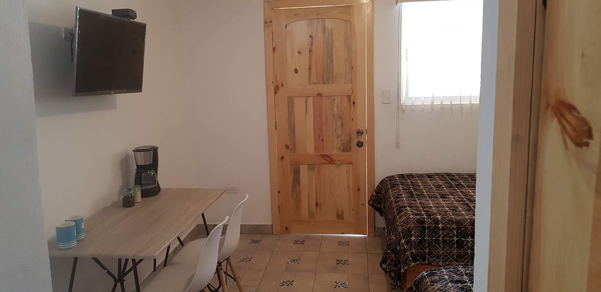 El departamento es tipo cabaña con techo de dos aguas, tiene un mezzanine donde esta ubicada la 2a.habitación, cocineta con estufa que inc. horno, refrigerador y los trastos elementales para cocinar,una mesa con ocho sillas y dos sillonsitos, que hacen las veces de un recibidor, la decoración de de tipo campestre. Nuestra forma de calefacción es un calentón de leña, un calentón a gas y un calentón eléctrico (para el baño).