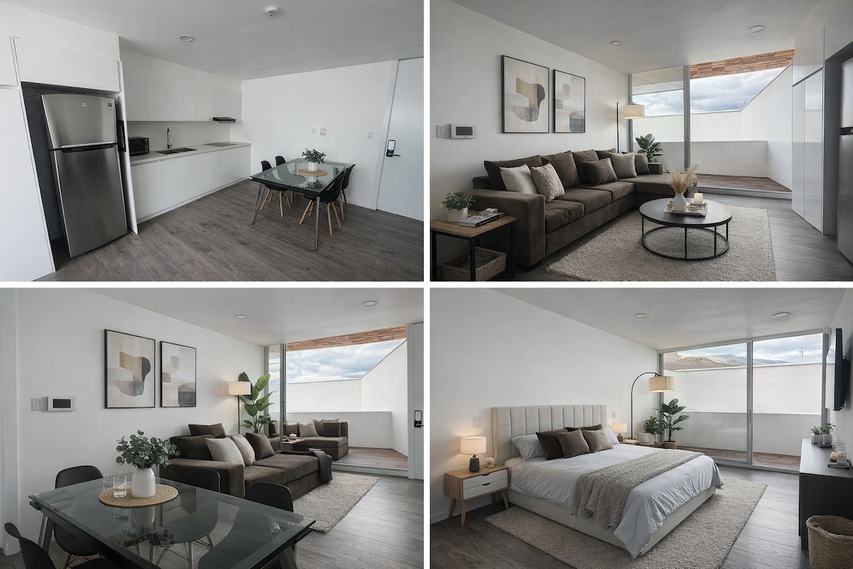 Elegant loft with quality finishes, perfect for executives/travelers seeking maximum security and comfort. Near Quinta Lucrecia, Mall del Río, Supermaxi. Includes: -Daily Gourmet Breakfast (fresh juice, 2 eggs, toast). Served at your door (8-10 am). Not available on Sundays -WiFi 6. -Secure Garage. -Smart locks, 65" Smart TV, electric fireplace. -Courtesy: Towels, shampoo, body wash. -Premium location, comfort, and security guaranteed! (Please avoid using towels for makeup removal).