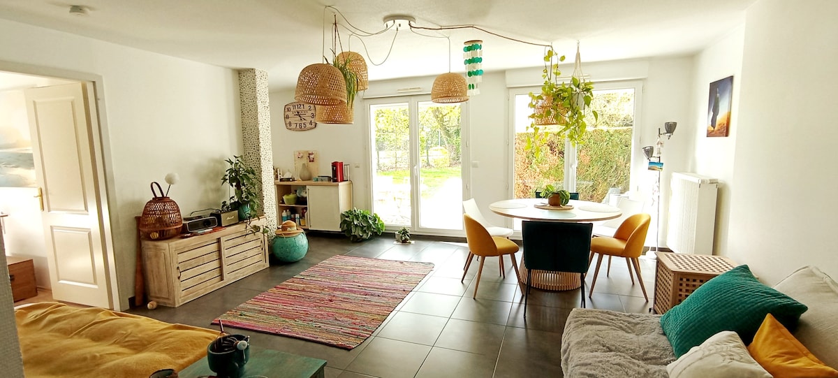 71 m2 apartment on the garden level with private parking, large terrace and garden that can accommodate 6 people and your pets, close to all amenities (cinema, bowling, shopping area 5 minutes away). Located in a quiet area and close to the wine route and highway, you can quickly get to Strasbourg: 20 min by train. Less than 15 minutes from Obernai, you are also close to a large German amusement park (Europapark), less than an hour's drive.