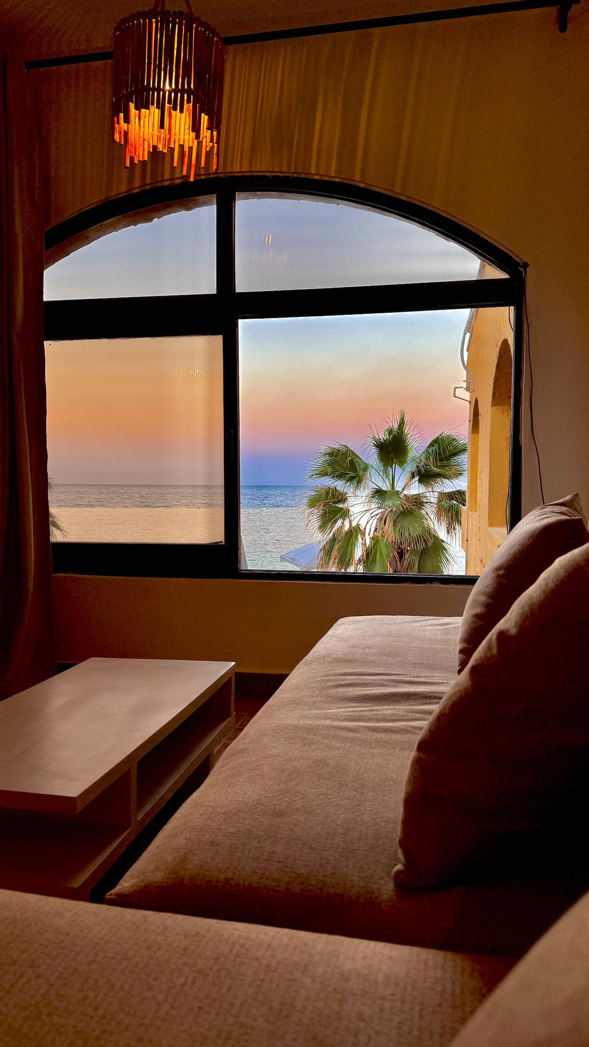 Welcome to your cozy home away from home in Dahab! Located on the first floor, the ‘Sea’-through apartment offers beautiful views of the sea through palm branches and sun rays, just as the picture shows. This spacious 1-bedroom apartment is filled with handmade furniture and accessories that reflect the organic and natural lifestyle we love in Dahab. Situated on the second line directly by the beach, it’s just a 3-minute walk to Assala market and a 10-minute walk to the Lighthouse.