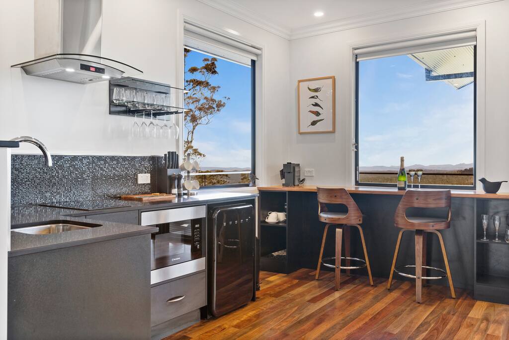 Be surprised on arrival at Tranquillity, your luxury mountain studio and see the amazing valley and forest views from its wrap around windows Sit on the balcony in summer or indoors in winter around the cosy log fire. Watch the mist in the valleys in the morning while perched eagle-high above the trees at the breakfast bar while sipping an expresso coffee. The private spa affords the same view while you enjoy a glass of your favourite wine. Tranquillity is what you will feel and remember.