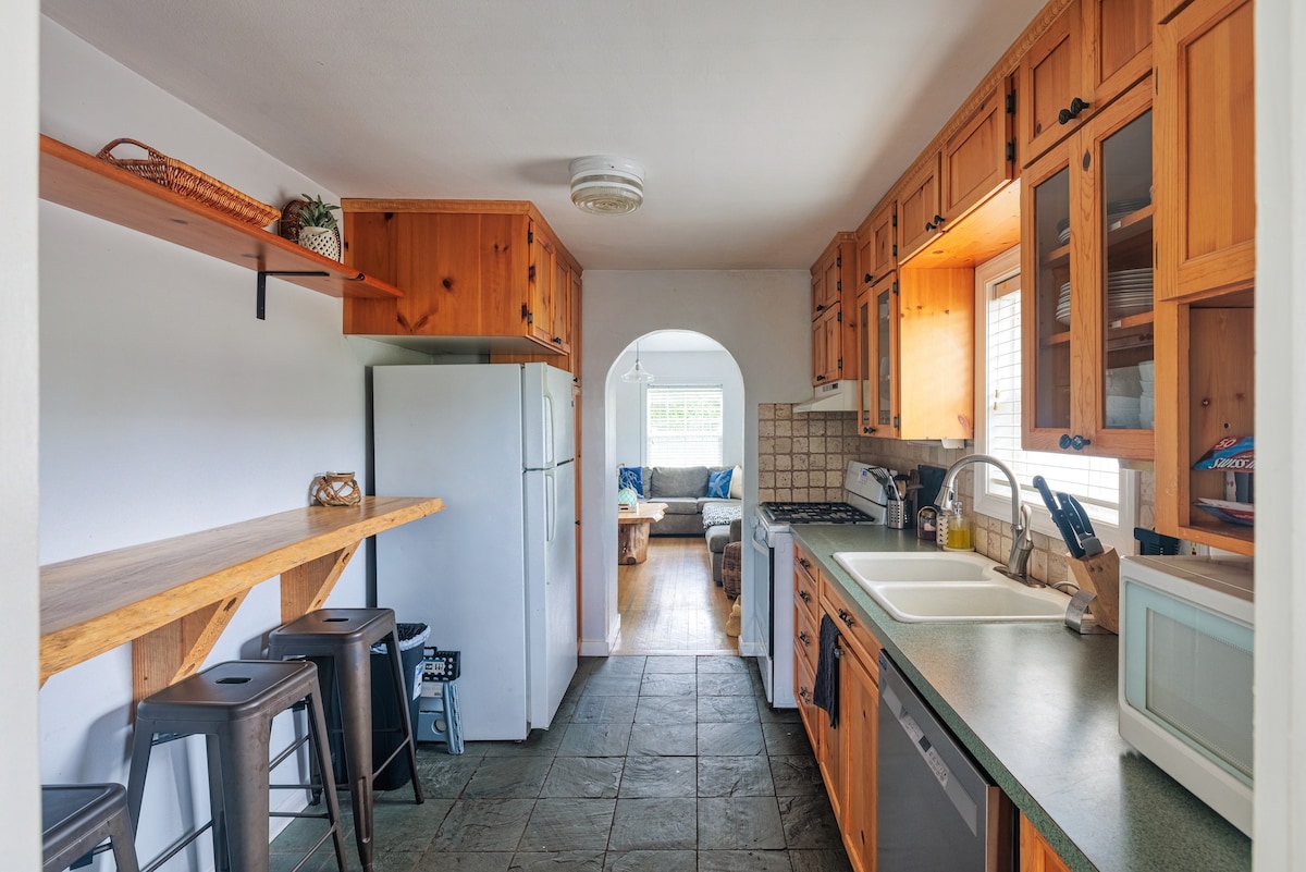 Private suite in our home overlooking Devil's Lake. One king bedroom plus a queen hide-a-bed in the living room. ONE or TWO add'l guests are $35/night EACH. Compact galley kitchen with under-counter fridge (no freezer), induction burner, convection oven/microwave, ice maker, coffee maker, electric tea pot, and cookware..Private entrance in a sunken courtyard. Completely renovated in Art Deco style. Not suitable for children under 12 and we do not accept them as guests.