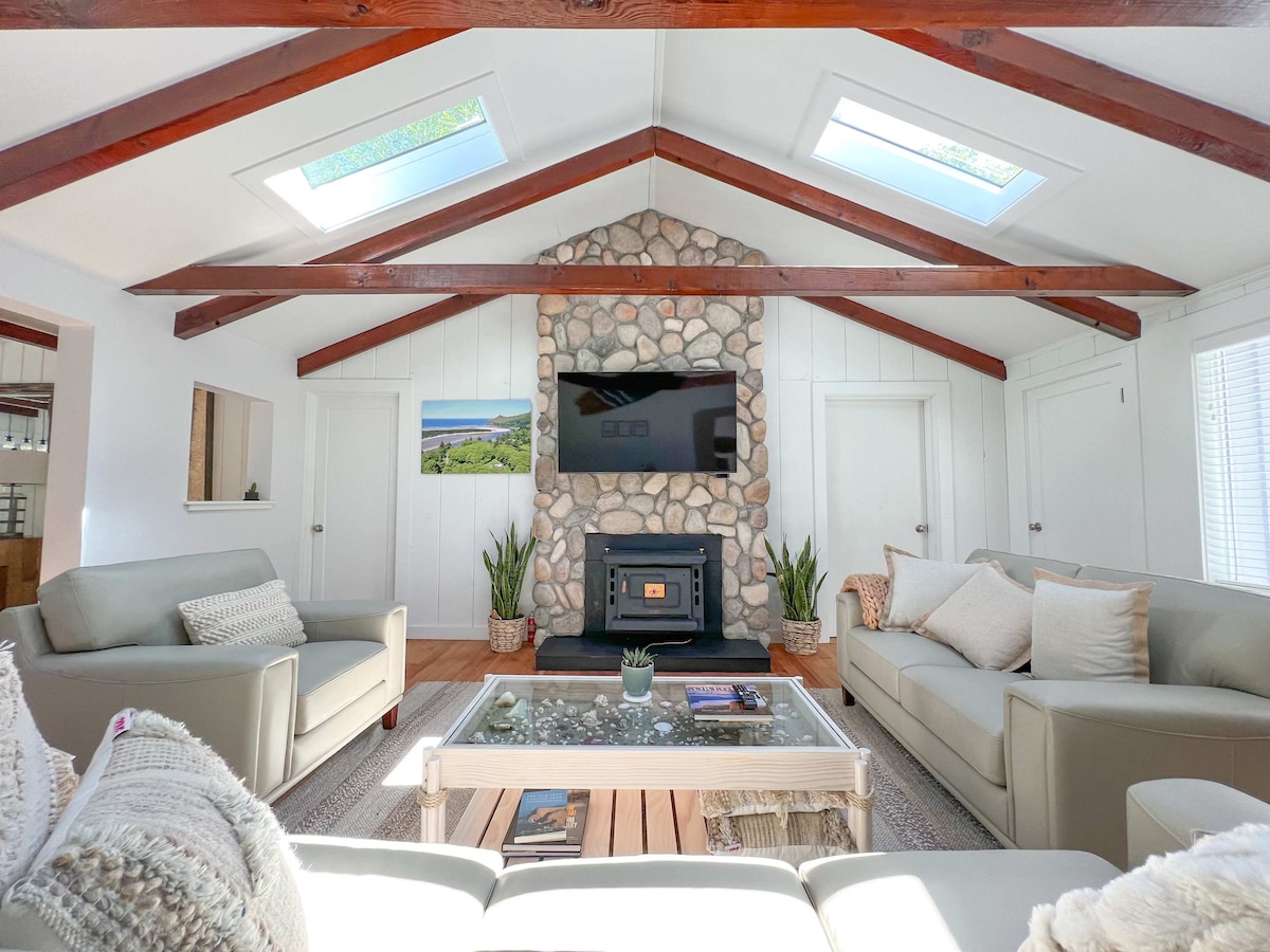AwayFrame on the Oregon Coast | By Hooray Stays Our 1960’s "A" maintains its midcentury style with luxurious & modern amenities: barrel sauna, private hot tub, & chef's kitchen to ensure an exceptional stay and relaxation. From the beautiful design & vaulted ceilings to the Scandinavian fireplace this home aims to please, be it a cozy night in or a day at the sandy beach. Just a short stroll to the Pacific Ocean, shops & foodie restaurants. Everything is well appointed with our guests in mind
