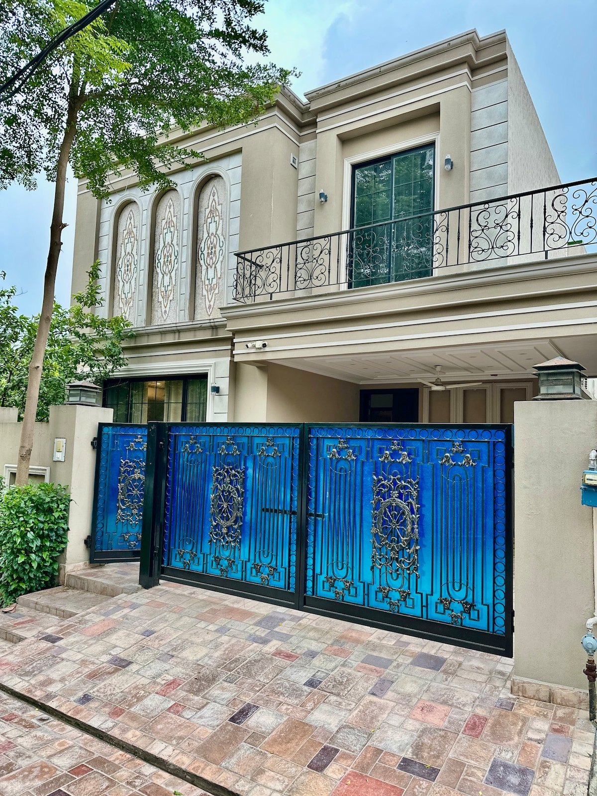 Welcome to our new, completely independent, fully equipped villa in DHA Phase 9. Perfect for families and travellers coming from abroad. Near Defence Raya, Dolmen Mall, PKLI Hospital and Ring Road. 30% off for month long booking. Experience tranquillity in family friendly neighbourhood. Relax with the whole family at this peaceful place to stay. 3 king bedrooms 4 baths, car garage, full kitchen. SAFETY: Electric fence on the walls. 4 CCTV camera on the outside with live view monitor.