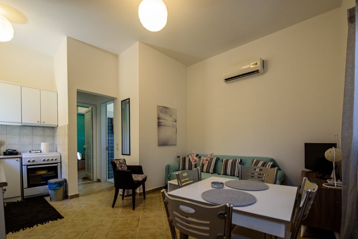 Nestled in the heart of the serene Salanti neighborhood, our exquisite apartment offers an unparalleled retreat for those in search of tranquility amidst vacation houses. Surrounded by the calming ambiance of this peaceful environment, the apartment promises a haven for relaxationt. Aditionally, the apartment promotes environmental responsibility by relying on solar energy harvested from its rooftop.