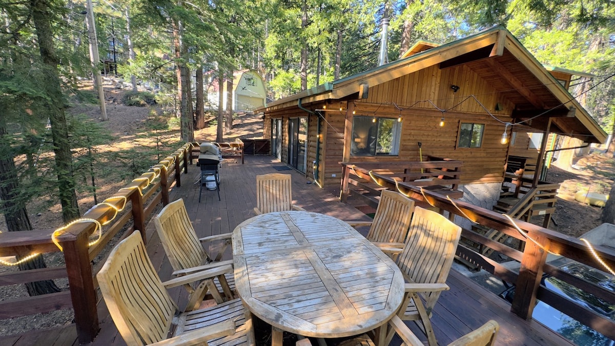 Enjoy an escape to crisp, clean mountain air and a relaxed lifestyle: Mountain Time. Curl up in front of the warm and welcoming fireplace, enjoy cocktails on the large deck, and take advantage of never ending outdoor activities. This three-bedroom, two bath mountain sanctuary is located just above the Stanislaus River in the Sierra Nevada Mountains. Elevation 5,000 feet. The cabin is a short walk from the Old Strawberry bridge and several forest trails.